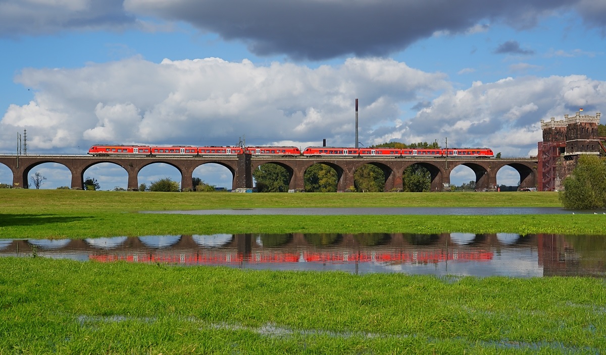 Der Stadler Flirt 3 428 503 der DB und ein weiterer 428 treffen am 02.09.2017 als RE 42 "Niers-Haard-Express" auf ihrer Fahrt von Mönchengladbach nach Münster in Krefeld-Uerdingen ein