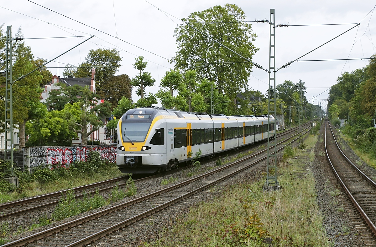 Ein Blick vom Loreleyfelsen nach Süden mit einem vier- und dreiteiligen Flirt von VIAS, der am 11.10.2023 als Rheingau-Linie RB 10 von Frankfurt am Main nach Neuwied unterwegs ist. Im Gegensatz zur rechtsrheinischen Bahn mit dem dichten ICE-, IC/EC- und RE-Verkehr ist dies die einzige Linie, die im Mittelrheintal auf der linken Rheinseite regelmässig verkehrt. An der Loreley liegt die engste Stelle des Mittelrheintals, hier und im Oberlauf ist der Fluss nicht nur sehr schmal, sondern hat auch eine starke Strömung und weist einige Untiefen sowie enge Kurven auf. Zur Vermeidung von Unfällen warnen hier Signalanlagen die Kapitäne vor Gegenverkehr (ganz unten rechts im Bild).