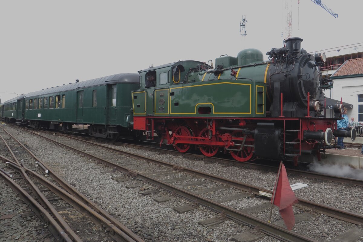 Ex-Hoogovens Lok 22 TOM steht mit Dampf am 6 Mai 2023 mit ein Dampfpendelzug in Maldegem während das Dampfwochenende der SCMs. Wegen Kontroversen über Umweltfeindliche Gasausstösse entscheidete Tata Steel (ehemahlige Hoogovens) die zwei für Exkursionen eingesetzte Dampfloks 'TOM' und 'BONNE' los zu werden; TOM hat ins SCM ein vorlaufiges neues Heimat gefunden.