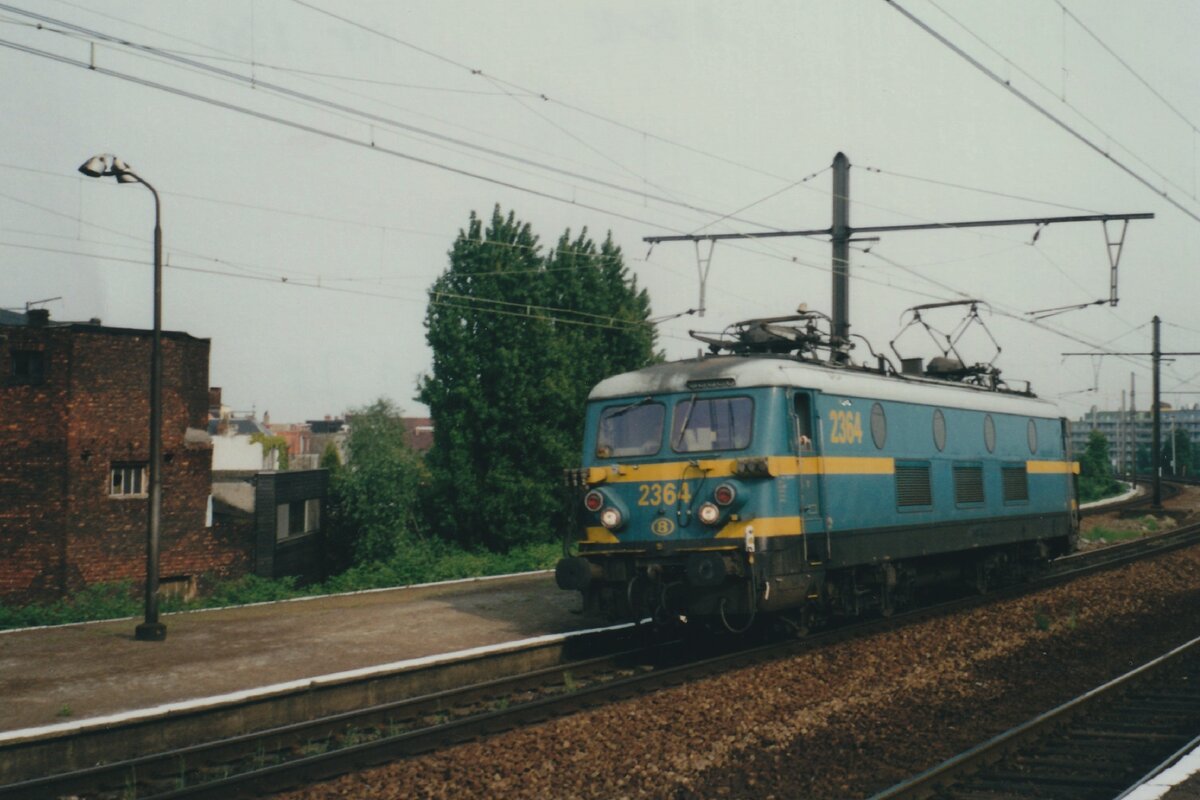 Scanbild von ein Froschblick auf SNCB/NMBS 2304 mit Schnellzug nach namur in Lüttich-Guillemins am Abend von 13 Juli 1999.
