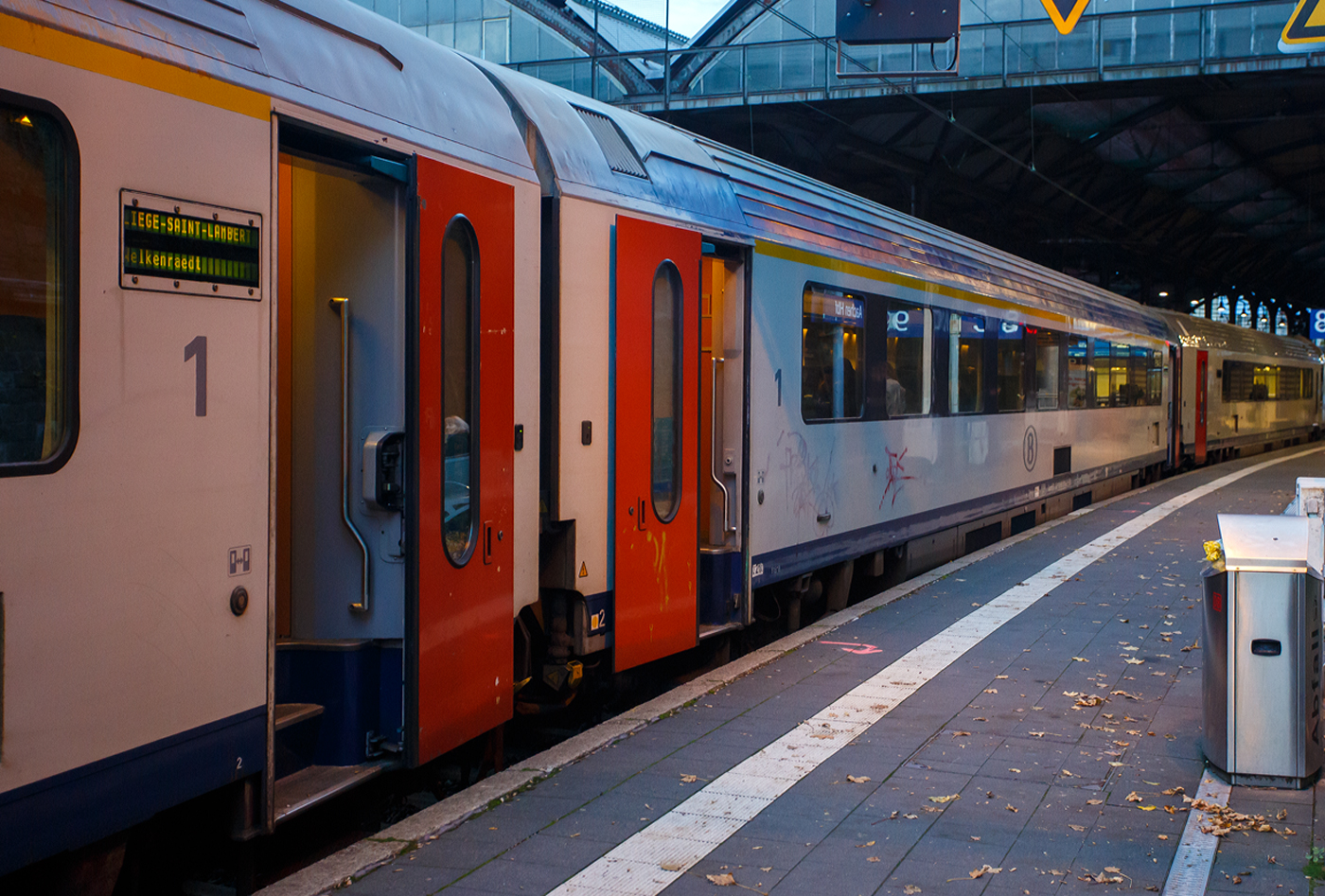 SNCB/NMBS - I11 Steuerwagen der zweiten Klasse mit Gepäckabteil, BDbfpm 61 88 80 90 011-2 B-B, ex 19811, eingereiht im Zugverband des euregioAIXpress (S41) von Liège-Saint-Lambert über Welkenraedt nach Aachen (d'Aix-la-Chapelle), am 21 Oktober 2025 im Hauptbahnhof Aachen. Der Wagen hat für 200 km/h die RIC-Zulassungen für Frankreich, Deutschland, Österreich, die Niederlande, Italien, die Schweiz, Luxemburg, sowie natürlich Belgien (F, D, A, NL, I, CH, L, B).