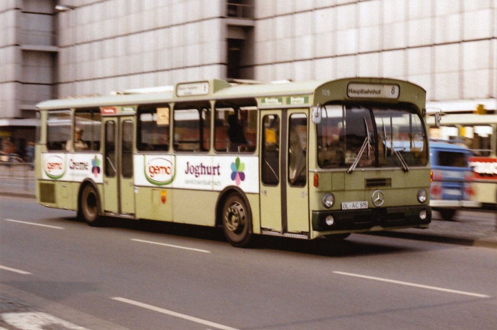 Wagen 136, OL-AC 886, EZ: 1974. Auch Wagen 136 hatte ich mit der ersten Version der TURM-Werbung bislang nur in s/w gezeigt. Hier nun eine Farbaufnahme aus dem Mai 1980. Der Bus steht an der Endstation der Linie 14 in OFENERDIEK. Die Endstelle lag damals in der Straße Am Strehl, direkt vor der dortigen Kneipe STREHLSCHÄNKE. Auf dem Bild schön zu erkennen sind die damals noch üblichen hölzernen Strommasten, die in den 80er Jahren nach und nach aus dem Strassenbild verschwanden. Auch Wagen 136 hatte zum Zeitpunkt dieser Aufnahme bereits Karosseriearbeiten über sich ergehen lassen müssen. Die horizontale Strebe unter dem Fenster des Fahrers und der hellere Farbton des Bleches darunter zeugen von diesen Ausbesserungsarbeiten.