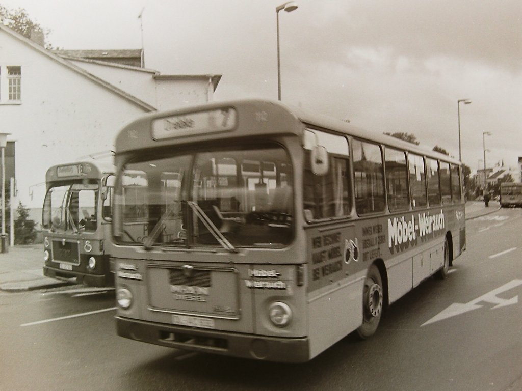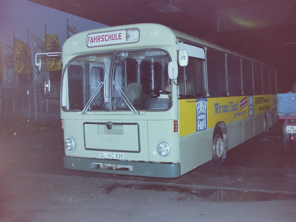 Wagen 115, OL-AC 935, EZ: 1970. Der Bus verläßt am 09.10.81 den Betriebshof in der Alexanderstraße, um als Einsatzwagen den Kramermarkt-Pendelverkehr zu bedienen. Ursprünglich war die Werbung der LANDESSPARKASSE ZU OLDENBURG weiß, mit schwarzer Schrift.