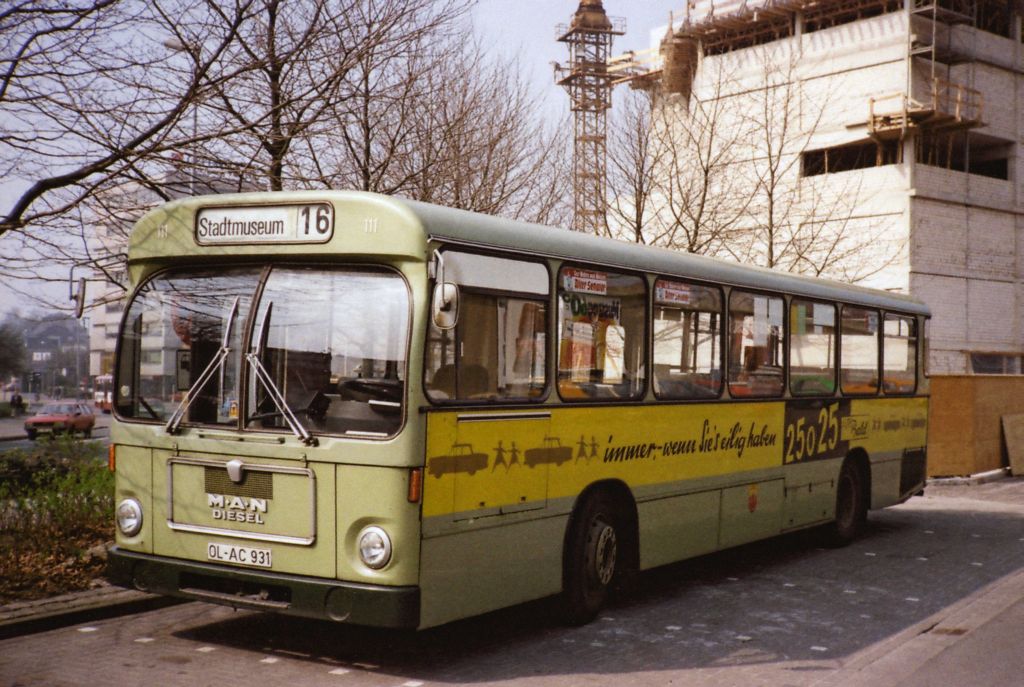 Wagen 117, OL-AC 937, EZ: 1971. Im März 1981 machte Werner Striepling diese Aufnahme von Wagen 117. Der Bus steht im Bundesbahnweg. Die auffällige Werbung für den Citröen Händler MUNDERLOH in der Kreyenstraße trug der Bus seine gesamte Dienstzeit über. Im Herbst 1981 wurde der Bus durch Wagen 53 ersetzt.