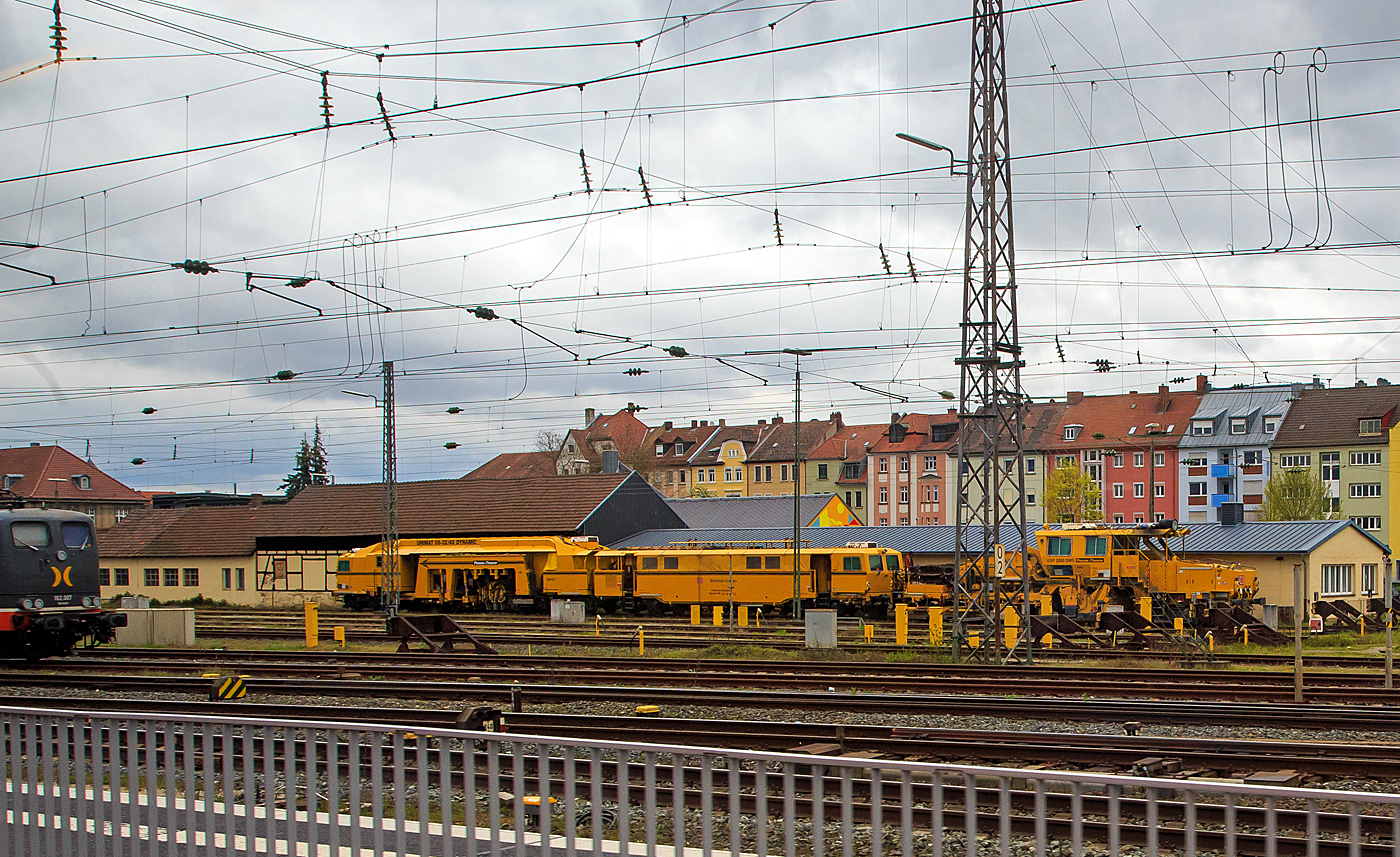 Eine Plasser & Theurer Universalstopfmaschine UNIMAT 09-32/4S DYNAMIC und ein Plasser & Theurer Universalschotterplaniermaschine USP 2000 SWS beide von der DB Bahnbau Gruppe sind am 17 April 2023 beim Bahnhof Bamberg abgestellt. Armin Schwarz