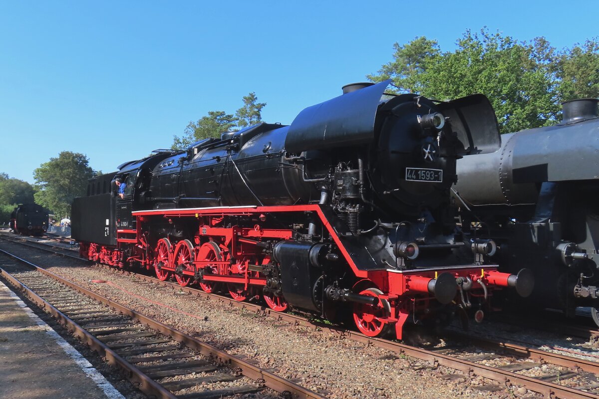 Der „Jumbo“ bzw. die schwere kohlegefeuerte fünffachgekuppelte Dreizylinder-Güterzug-Dampflokomotive 44 508, ex DB 044 508-0, am 07 Juli 2024 ausgestellt beim Lokschuppen vom Erlebnisbahnhof Westerwald der Westerwälder Eisenbahnfreunde 44 508 e. V. hier war Lokschuppenfest. Nun erstrahlt sie im vollen Glanz, auch die Treib- und Kuppelstangen sind nun wieder montiert. Die Dampflokomotive 44 508 wurde im Jahr 1941 von der Lokomotivfabrik Krauss-Maffei in München unter der Fabriknummer 16113 gebaut und an die DR geliefert. Nach dem Krieg blieb sie im Westen und wurde so 1949 als 44 508 in den Bestand der Deutsche Bundesbahn aufgenommen, mit der Einführung des EDV-Nummernschemas wurde sie zum 01.01.1968 in 044 508-0 umgezeichnet. Seit Mitte der 1950er Jahre ist sie gekuppelt mit dem 2'2'T34 Tender der ex ÖBB 44 1561 (Borsig Lokomotiv-Werke GmbH, Hennigsdorf-Berlin, Baujahr 1940, Fabriknummer 15400). Bis zu ihrer Außerdienststellung im Mai 1977, im BW Gelsenkirchen-Bismarck legte sie eine Strecke von über 1.9 Millionen Kilometern zurück. Die Maschine verfügt über ein Drei-Zylinder-Triebwerk, fünf Antriebsachsen und einen Schlepptender, in dem sie 10 Tonnen Kohle und 34 Kubikmeter Wasser mitführen kann. Sie erreicht eine maximale Leistung von 1.910 PS bei einem Dienstgewicht von 160 Tonnen. Die 44 508 wurde im Mai 1977 beim Bahnbetriebswerk Gelsenkirchen-Bismarck außer Dienst gestellt. Die 44 508 ist eine der letzten erhaltenen Dampflokomotiven ihrer Bauart. Sie wurde im Jahr 1987 durch eine Freizeitgruppe des Bahn-Sozialwerkes (BSW) übernommen. Damit begann die museale Aufarbeitung der Lok, die im Jahre 2002 jedoch unterbrochen wurde, als das Domizil in Siershahn geräumt werden musste. Der Verein Westerwälder Eisenbahnfreunde übernahm diese Dampflokomotive als Leihgabe des DB Museums, auch wenn sie nie im Westerwald eingesetzt war.