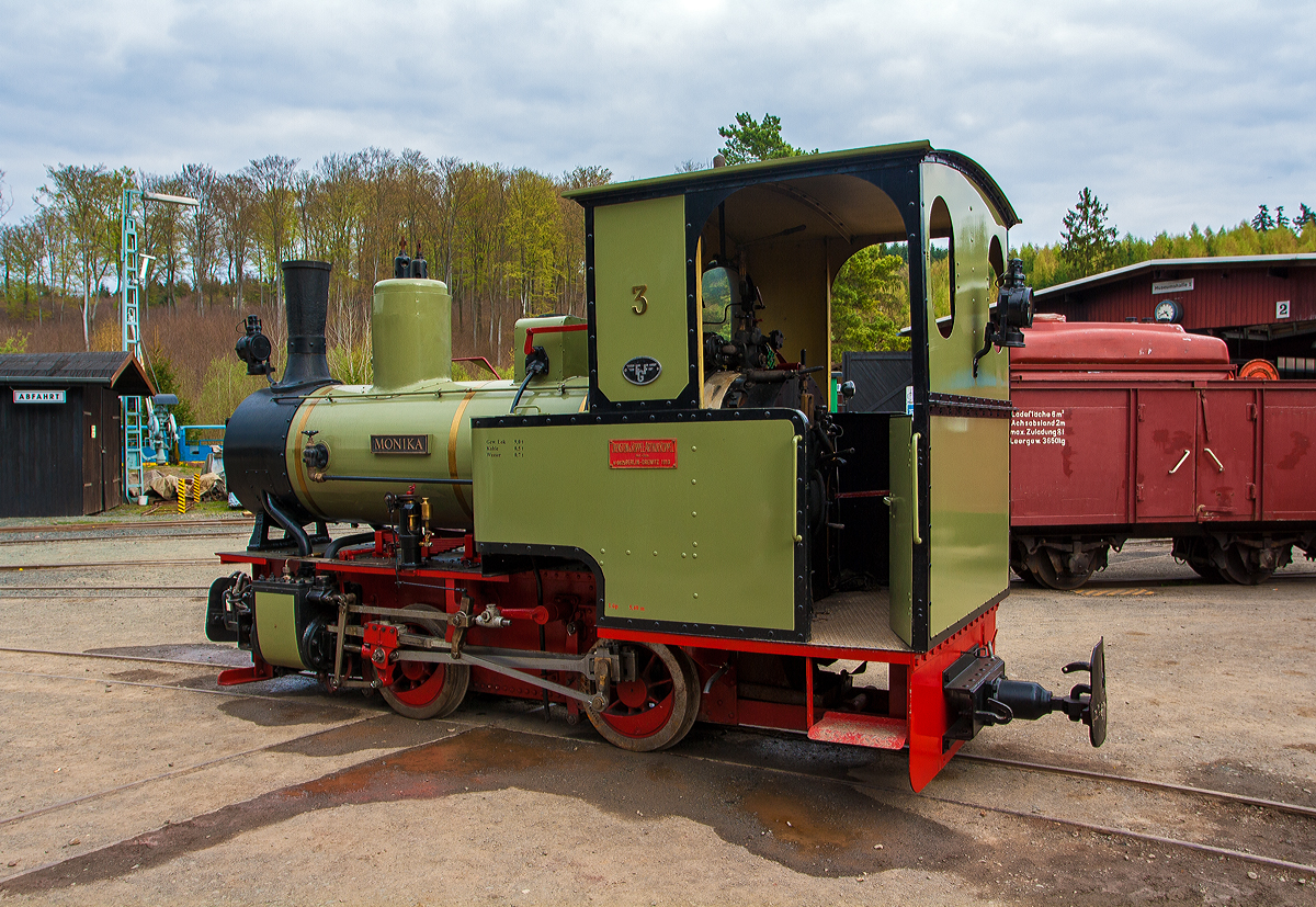 Die FGF Lok 4 vom Fortuna Feld- und Grubenbahnmuseum eine Krauss Typ XLVII p schmalspurige (600 mm) Schlepptender-Dampflokomotive der Gattung Bn2t, steht am 16.04.2011 im Museum Solms-Oberbiel, mit einem Zug zur Abfahrt für eine Rundfahrt bereit.
