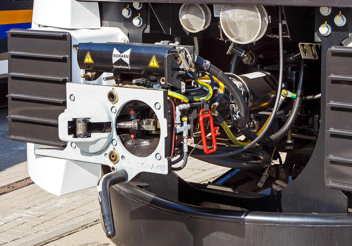 Lok-Zugeinrichtung (Schraubenkupplung) vom Typ F 206-80 der STABEG Apparatebau GmbH (Wien), an dem LINSINGER Schienenfräszug SF 03 FFS, Schweres Nebenfahrzeug Nr. 99 80 9427 019-1 D-ALPHA (ex 97 33 07 502 18-5), der Alpha Rail Team GmbH & Co. KG, Berlin, abgestellt am 11.06.2016 in Betzdorf (Sieg).