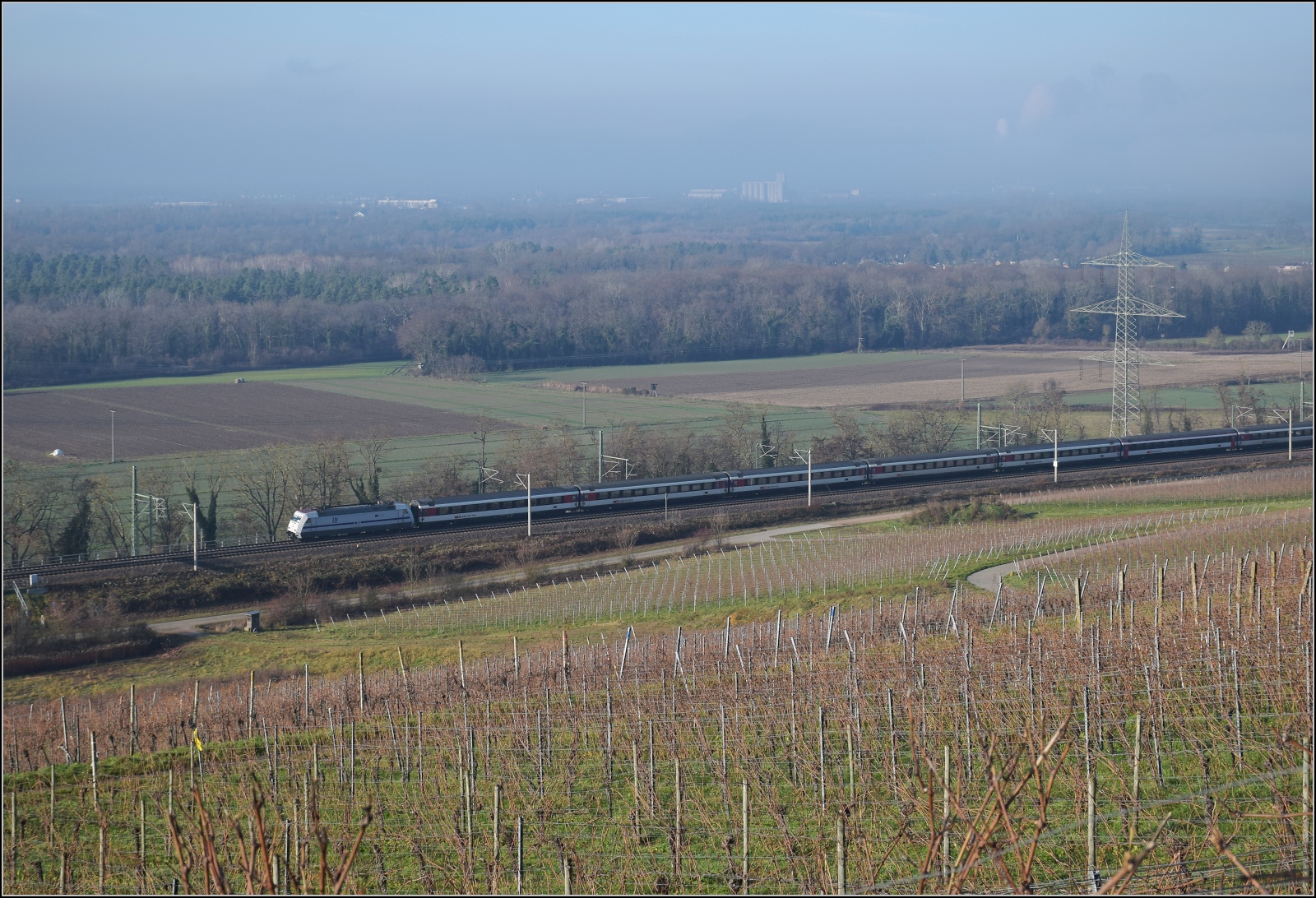 101 110 mit dem allerletzten EC nach Basel, dem EC 9. Ab dem Fahrplanwechsel fährt kein Eurocityzug mehr in die Schweiz. Schliengen, Dezember 2025.