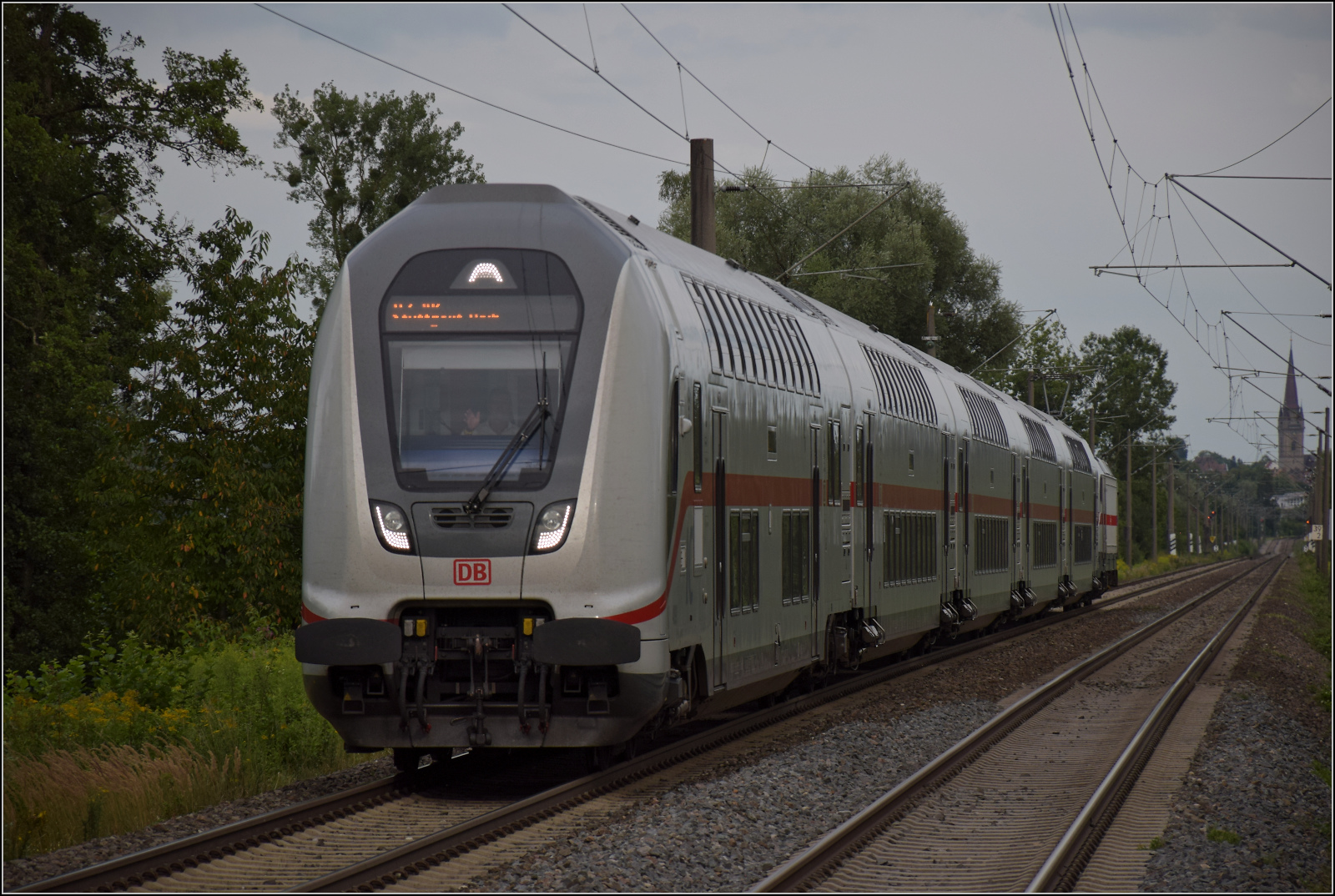 Mit dem Seehas auf Überholspur. Gleich mit zwei Zügen hätte ich den Radexpress überholen können. IC2 mit dem Wagenpark 2855 und 147 552 fährt nach Stuttgart. Dieser Zug fährt mittlerweile seit 7 Jahren nicht nach Zürich, wie ursprünglich vorgesehen. Im Hintergrund ist noch das Radolfzeller Münster zu sehen. Böhringen, August 2024. Olli