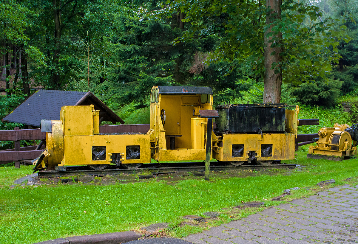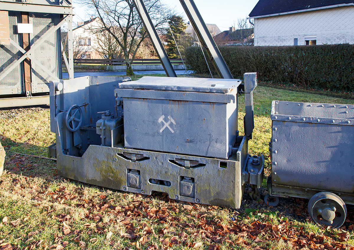 Ein Bergbau-Denkmal in Höhn (Westerwald), hier war bis 1961 die Braunkohlengrube "Alexandria" in Betrieb. Neben dem alten Förderturm befindet sich eine kleine Bartz-Akkulok und drei Grubenwagen. Höhn (Ww) am 10.12.2016