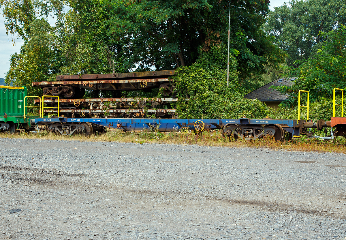 1.000mm-Schmalspur-Containertragwagen der Brohltal-Schmalspureisenbahn Betriebs-GmbH BEG 605, der Gattung S4kk, ex der spanischen FEVE 0.033, am 03.08.2020 in Brohl-Lützing auf der Gleisanlage Rheinanlagen der Brohltal Eisenbahn.
