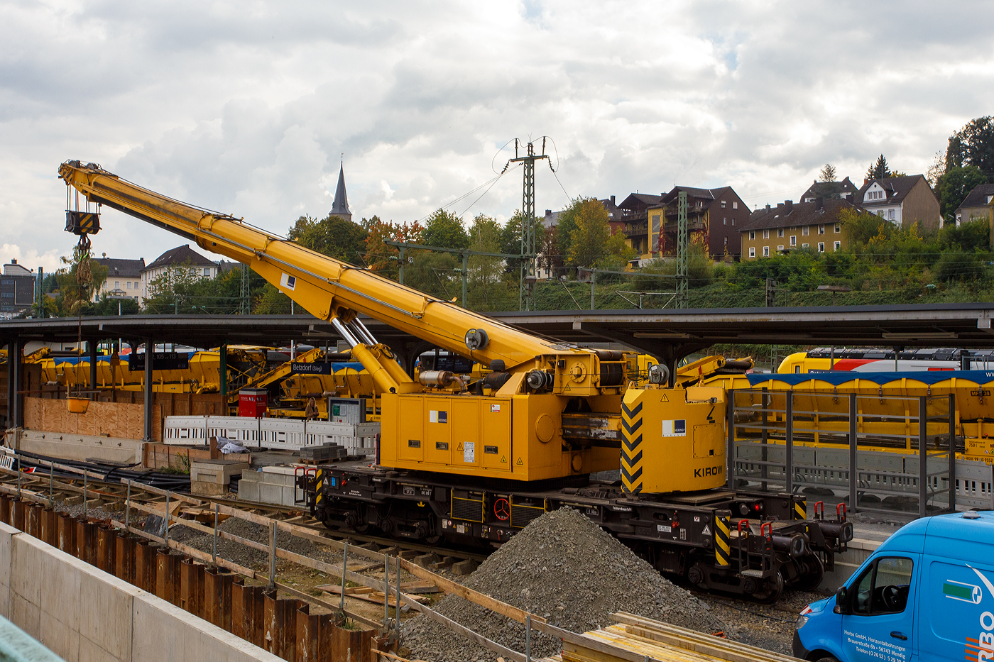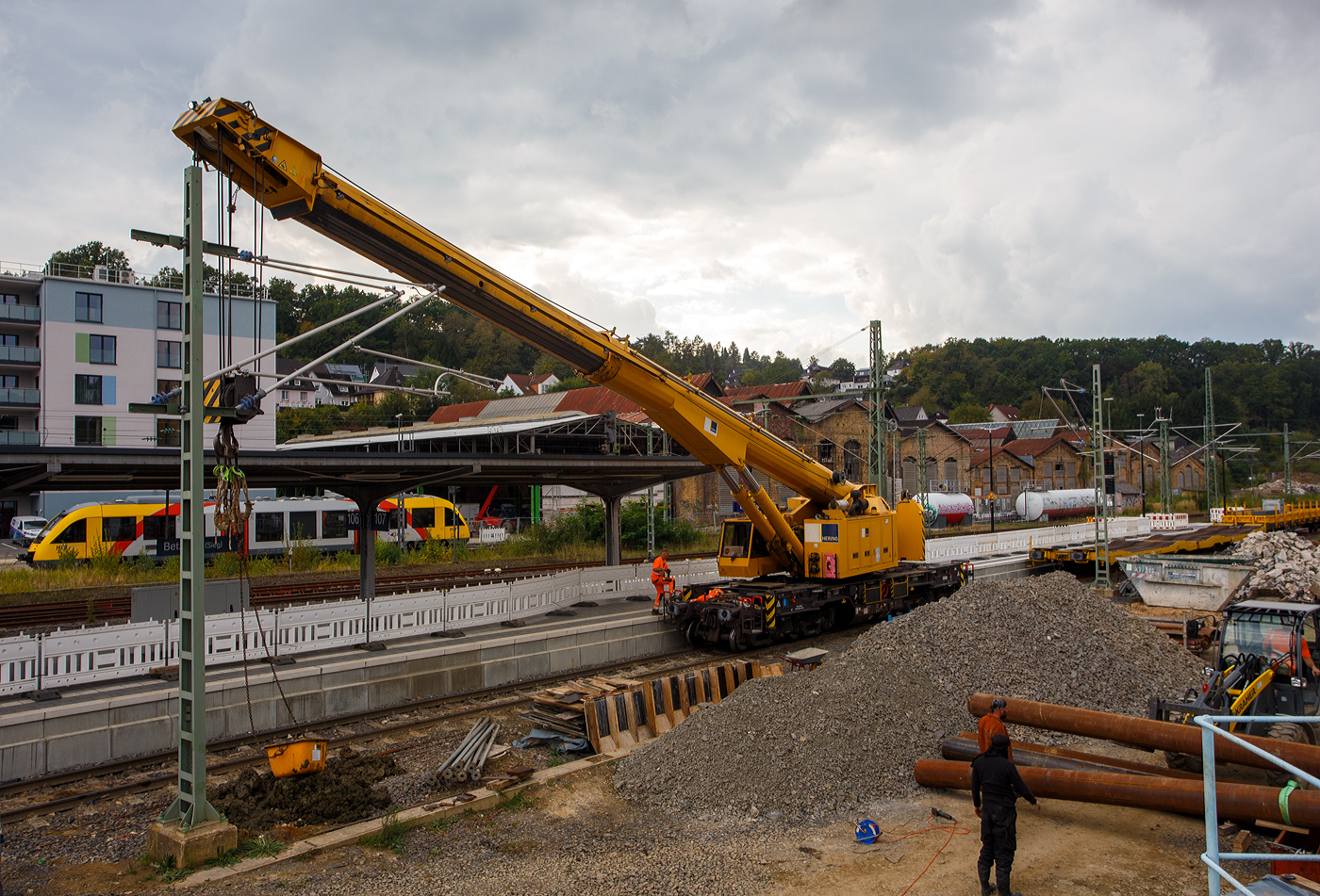 Der 125t Gleisbauschienenkran KIROW Multi Tasker KRC 810 T der Hering Bau (Burbach), Schweres Nebenfahrzeug Nr. D-HGUI 99 80 9419 000-1, ist am 04.09.2020 in Koblenz-Lützel abgestellt. (Aufnahme aus dem DB Museum heraus).