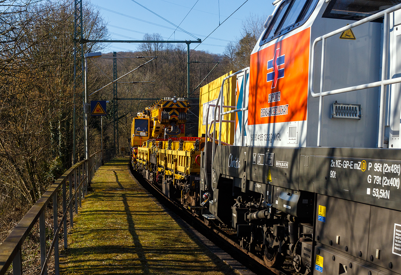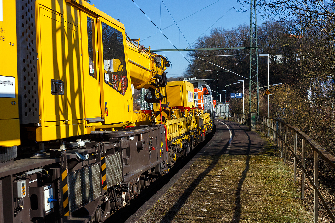 Die an die BEG - Bocholter Eisenbahngesellschaft mbH vermietete 4185 132-2 „Christa“ (92 80 4185 132-2 D-NXRL), eine Vossloh DE 18 der Nexrail AssetCo Sàrl (Luxembourg) fährt am 17 Februar 2025, mit dem Kirow KRC 1200 Kranzug der MGW Gleis- und Weichenbau-GmbH & Co.KG (Berlin), durch Scheuerfeld/Sieg in Richtung Siegen. Hinter der Lok sind der Schutzwagen D-MGWB 37 80 3999 232-4, der KRC 1200 Kranwagen D-MGWB 99 80 9519 003-4 und der Gegenlastwagen D-MGWB 99 80 9310 031-6.