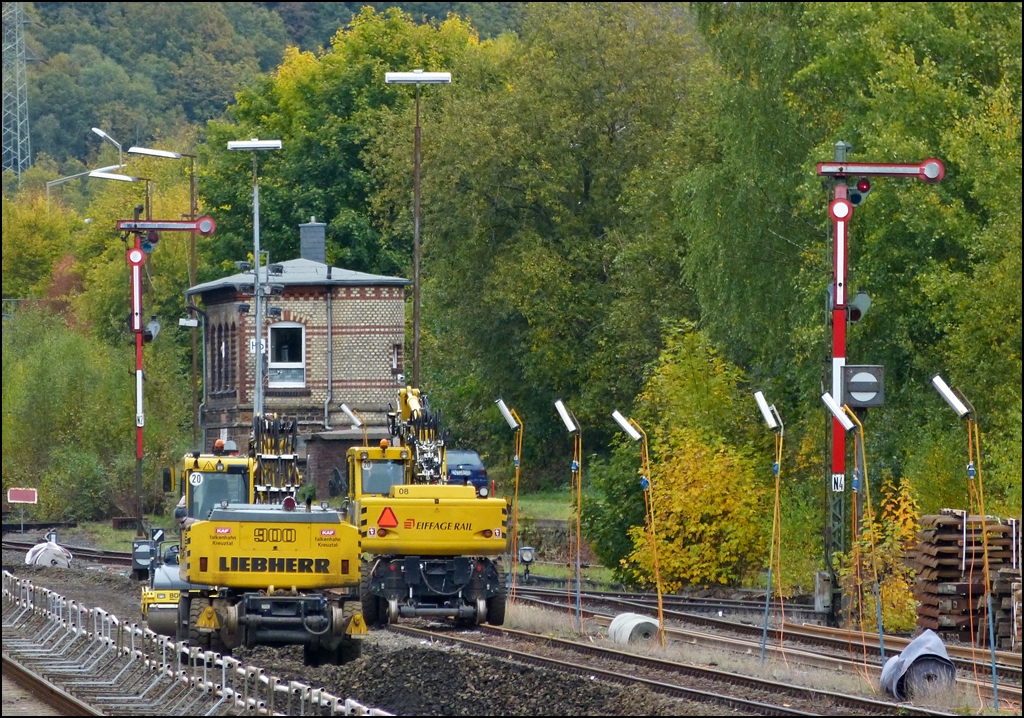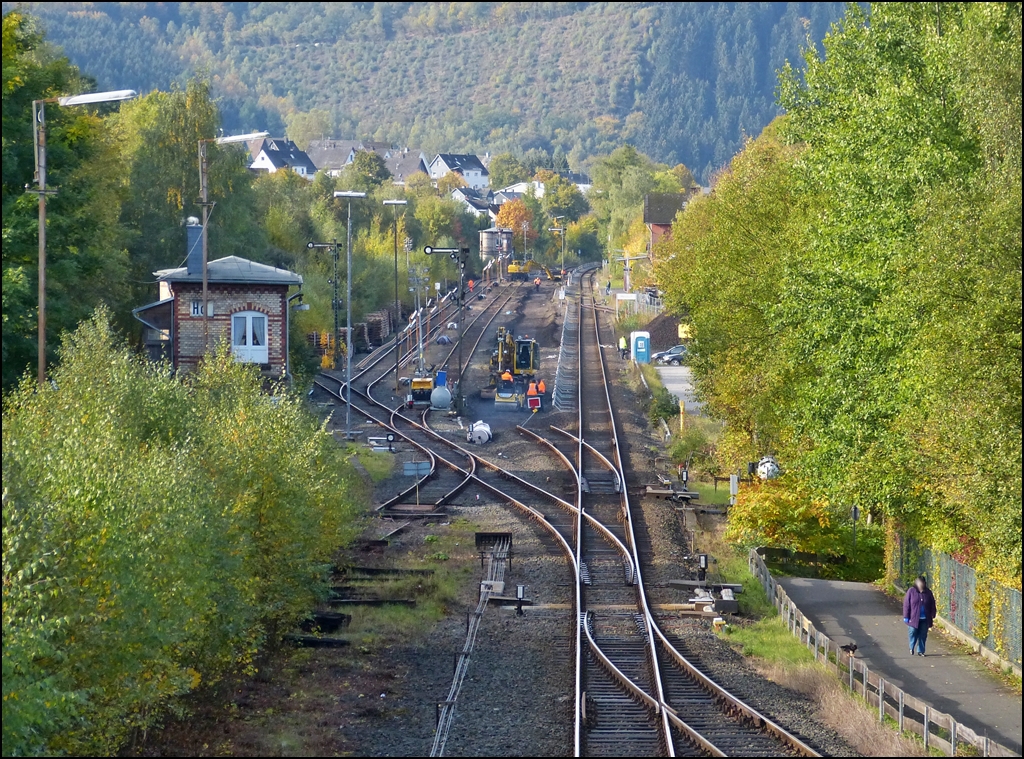 - Gleisbauarbeiten in Herdorf - Vor dem schon mit Altschotter befüllten RES Güterwagens liegt eine Rolle spezieller Folie, welche unter dem neuen Schotter im Gleisbett angebracht wird. 15.10.2012 (Hans)