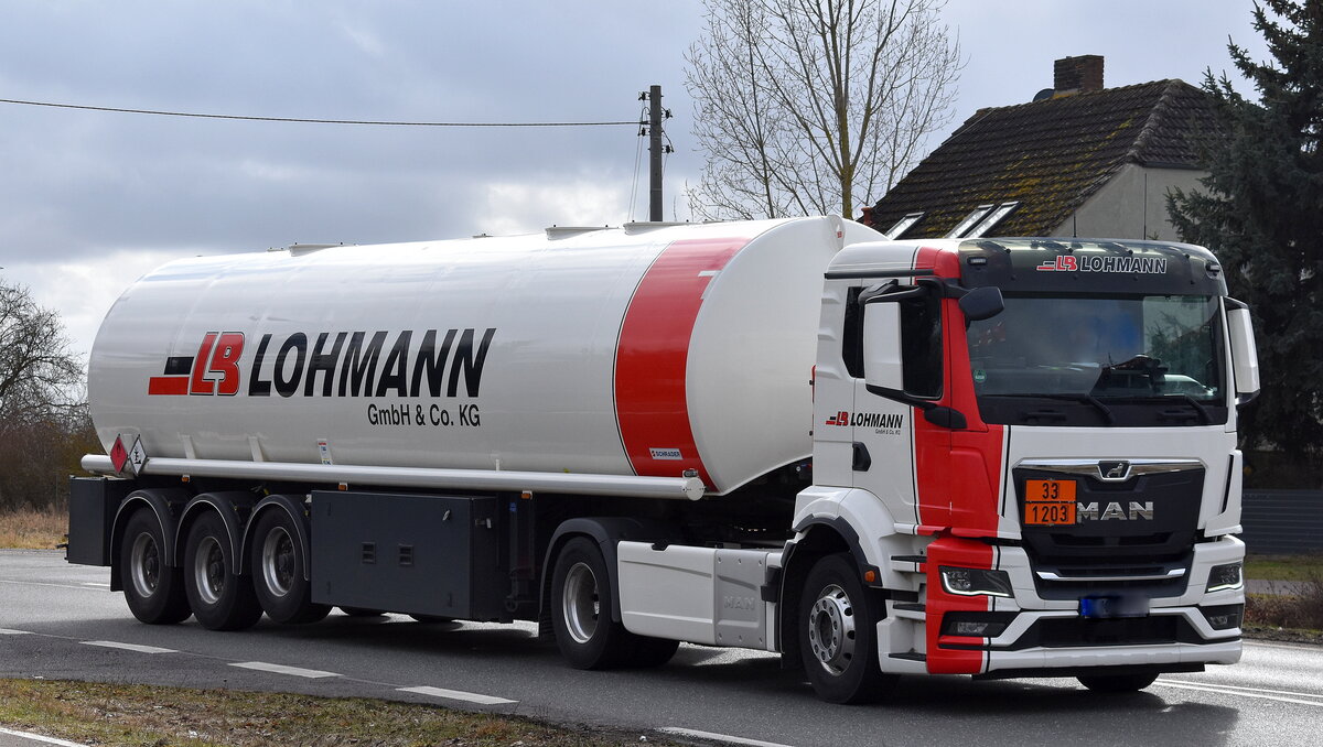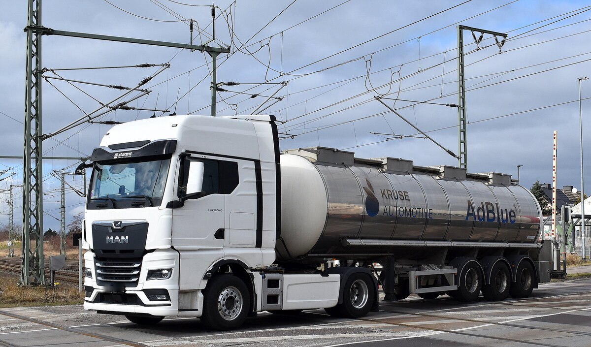 STORK Umweltdienste GmbH mit einem MAN TGS 26.510 Tanklaster lt. UN-Nr.: 30/1202 mit Dieselkraftstoff beladen mit Pritschenhänger am Haken am 24.02.26 Bahnübergang Rodleben.