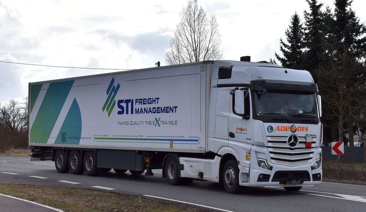 Spedition Scheffels KG mit einem Sattelzug mit MB ACTROS 1845 Zugmaschine am 13.10.25 Höhe Bahnübergang Rodleben.