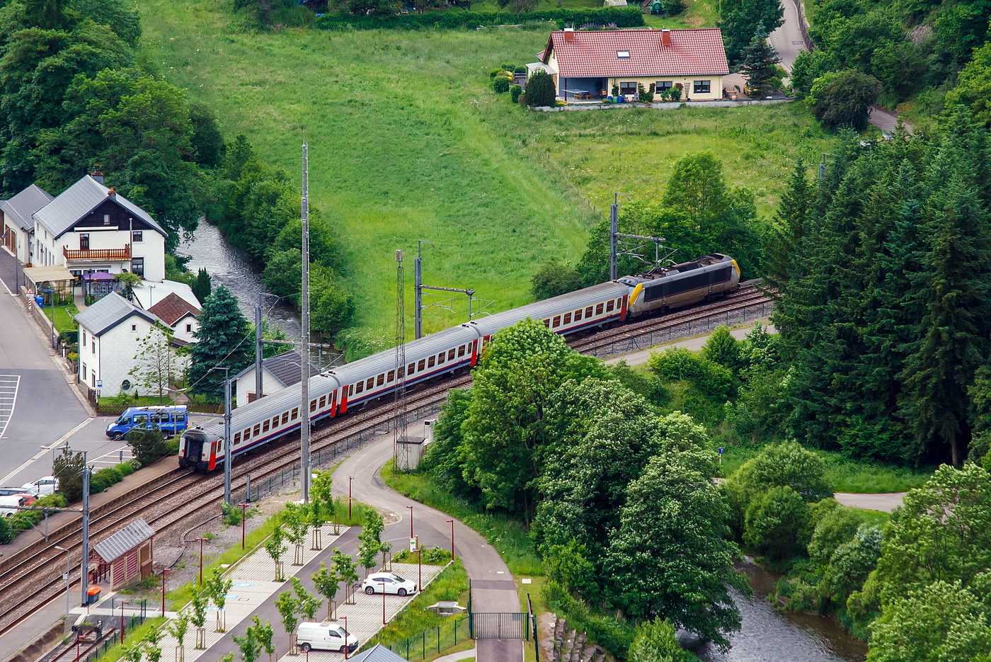 Blick von der Hockslay, die CFL 3006 hat am 15 Juni 2013 mit belgischen I11 Reisezugwagen als IR von Luxembourg über Troisvierges und Liège (Lüttich) nach Liers(B) den Bahnhof Kautenbach (Kautebaach) an der Nordstrecke (Linie 10) erreicht.
