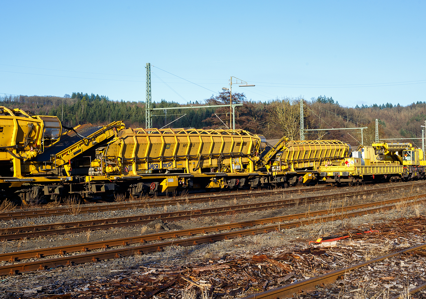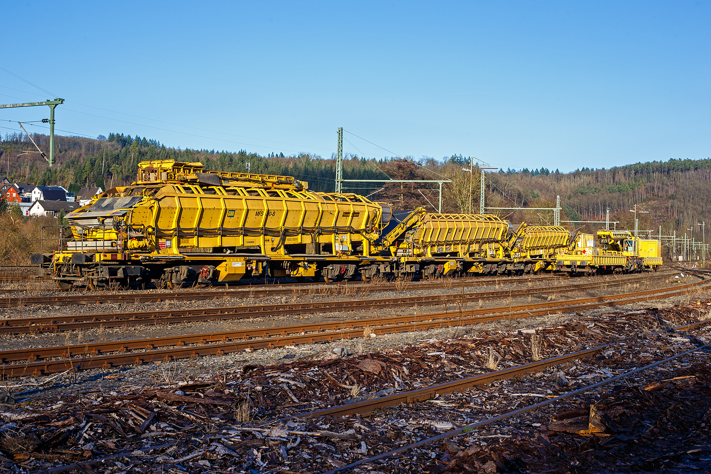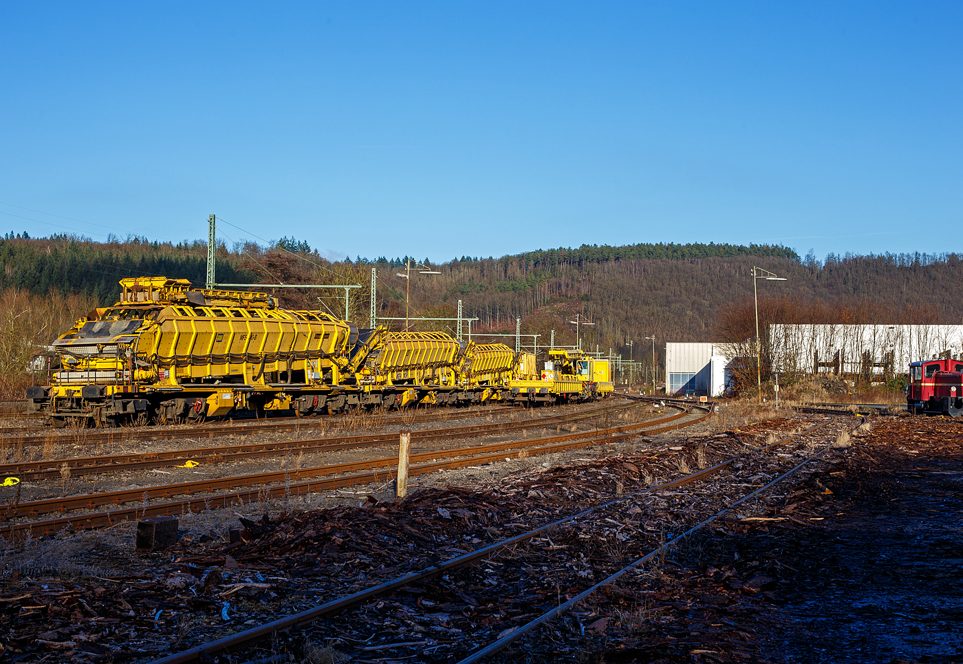 Den versuch die Länge des Gleisumbauzuges in einem Bild festzuhalten kann ich vergessen, Lok 2016 906 fährt mit 6 vollbeladenen Siloschotterwagen an Mecher in Richtung Clervaux um diese zu entladen. Bild aufgenommen von der Strasse Mecher – Weicherdange über dem Tunnel. 06.04.2021