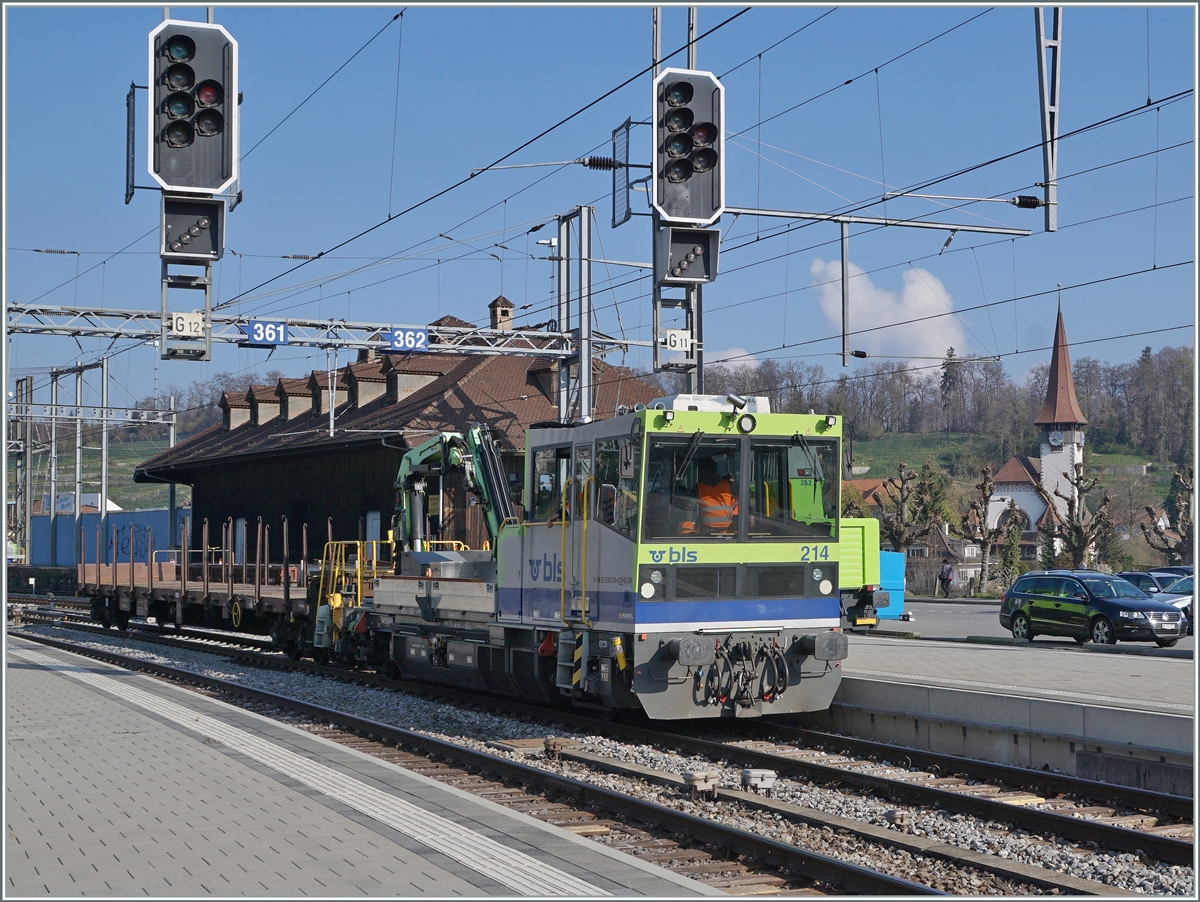 Der Robel BLS Tm 253 214 (98 85 5235 214-4 CH-BLSN) rangiert in Spiez. 14. April 2021