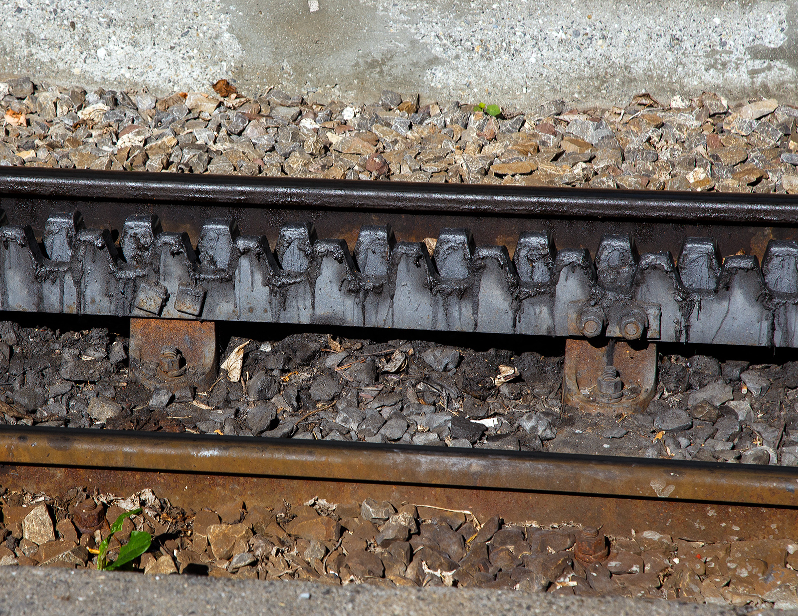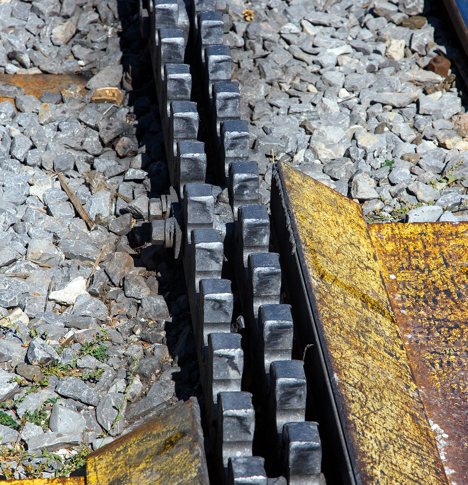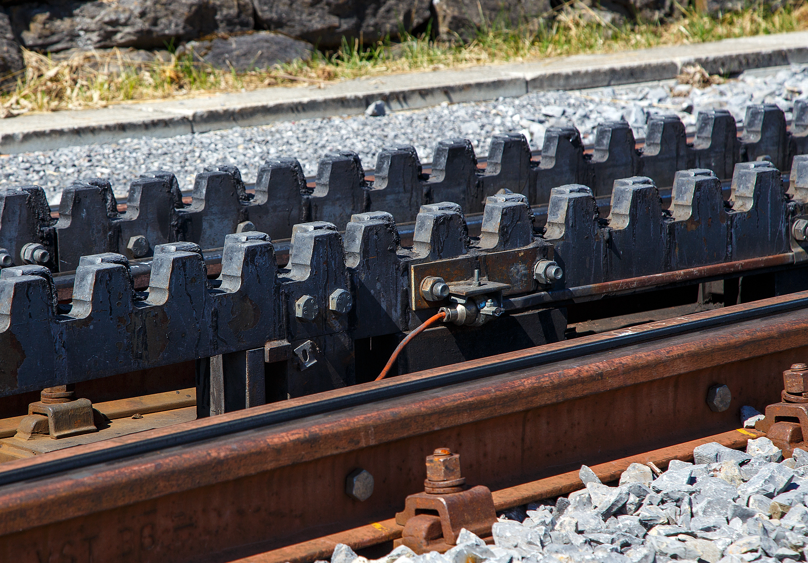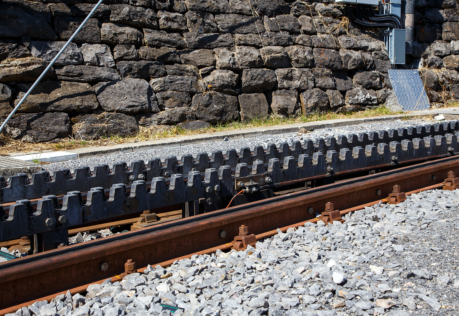 Deteilbild einer Weiche der zweilamelligen hochliegenden Zahnstangen vom System Abt, hier der tpc BVG - Chemin de fer Bex–Villars–Bretaye, hier am 10 September 2023 beim Haltepunkt Bouquetins auf 1.758 m ü. M, der Strecke 128 (Villars-sur-Ollon–Col-de-Bretaye).Geführt von dem Steuerwagen tpc BVB Bt 54 kommt der tpc BVB Pendelzug (Steuerwagen BVB Bt 54, Personenwagen tpc BVB B 51 und die BVB HGe 4/4 32 „Villars“) vom Bergbahnhof Col-de-Bretaye (1.808 m ü. M.) hinab.