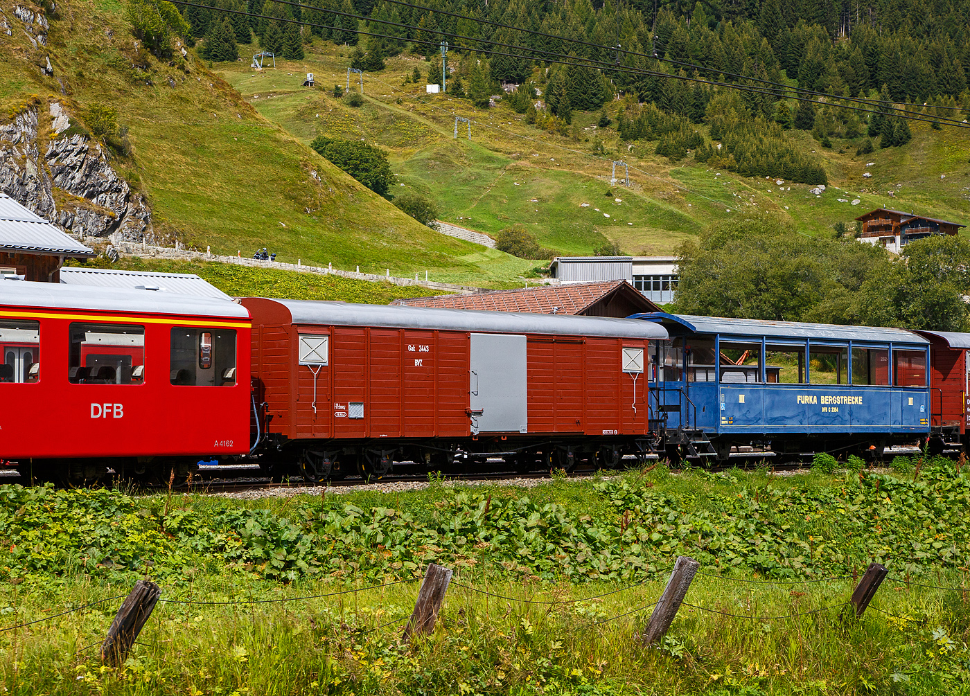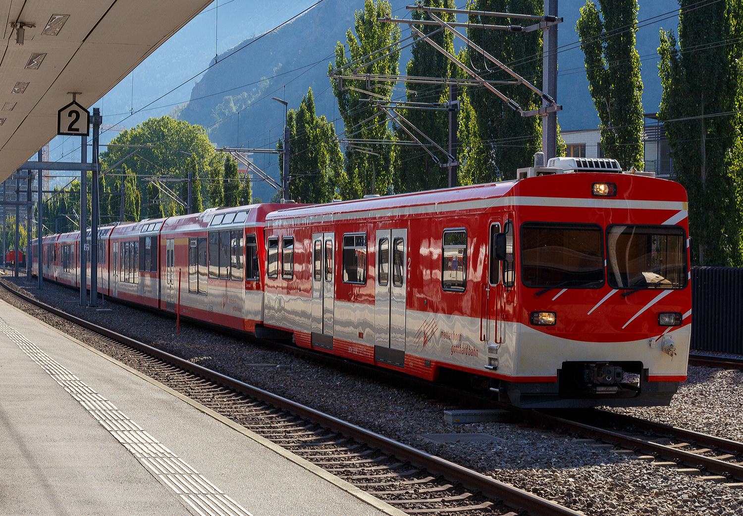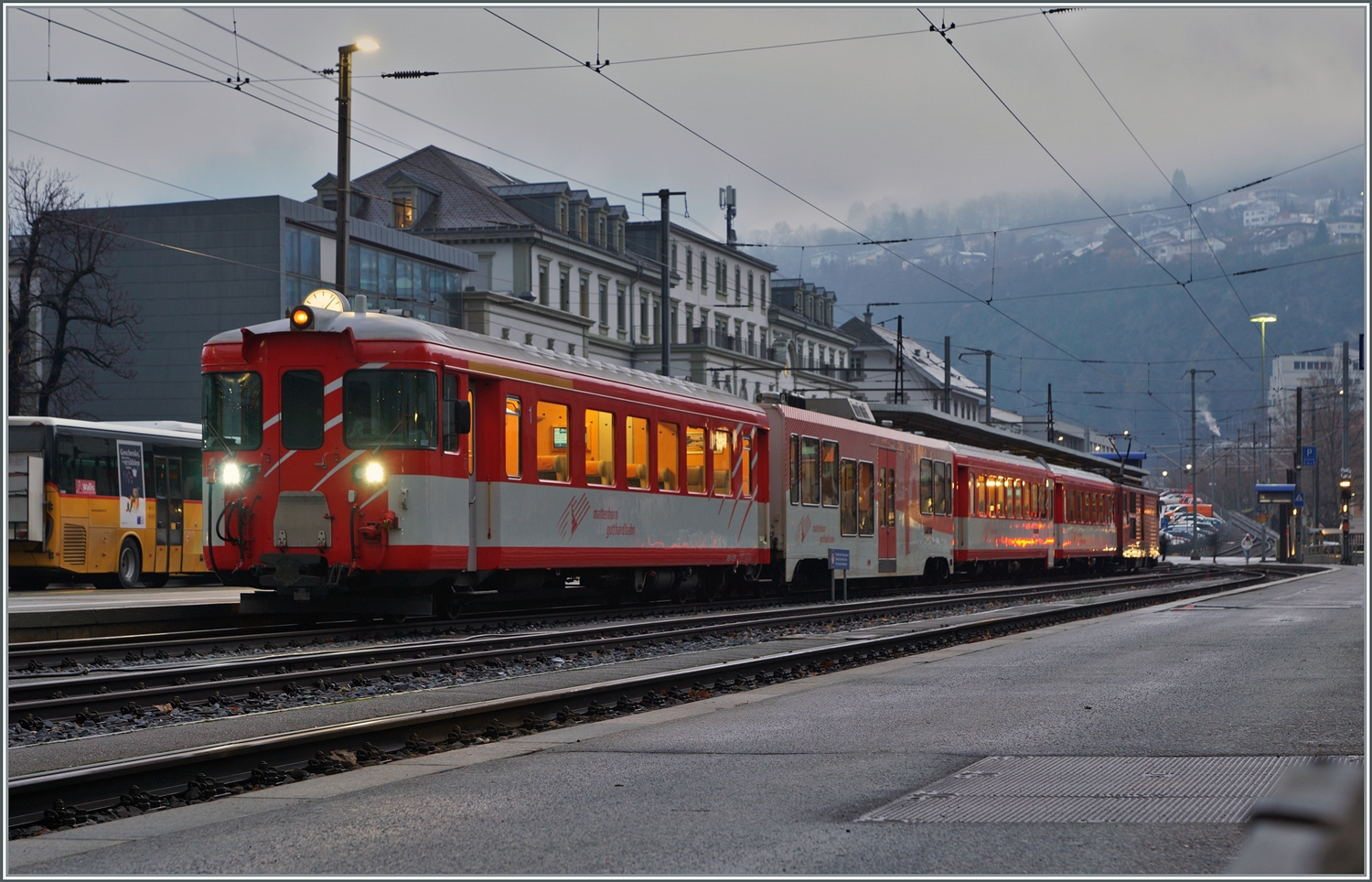 Ein abendlicher Blick vom Balkon des Hotels Europe in Brig am 19.06.2016, auf den Bahnhof Brig. Vorne der Bahnhofvorplatz mit den Gleisen und Bahnsteigen der MGB, wo gerade der "KOMET" ABDeh 4/8 - 2022 als RB nach Zermat hält. Hinten das Empfangsgebäude vom SBB Bahnhof.