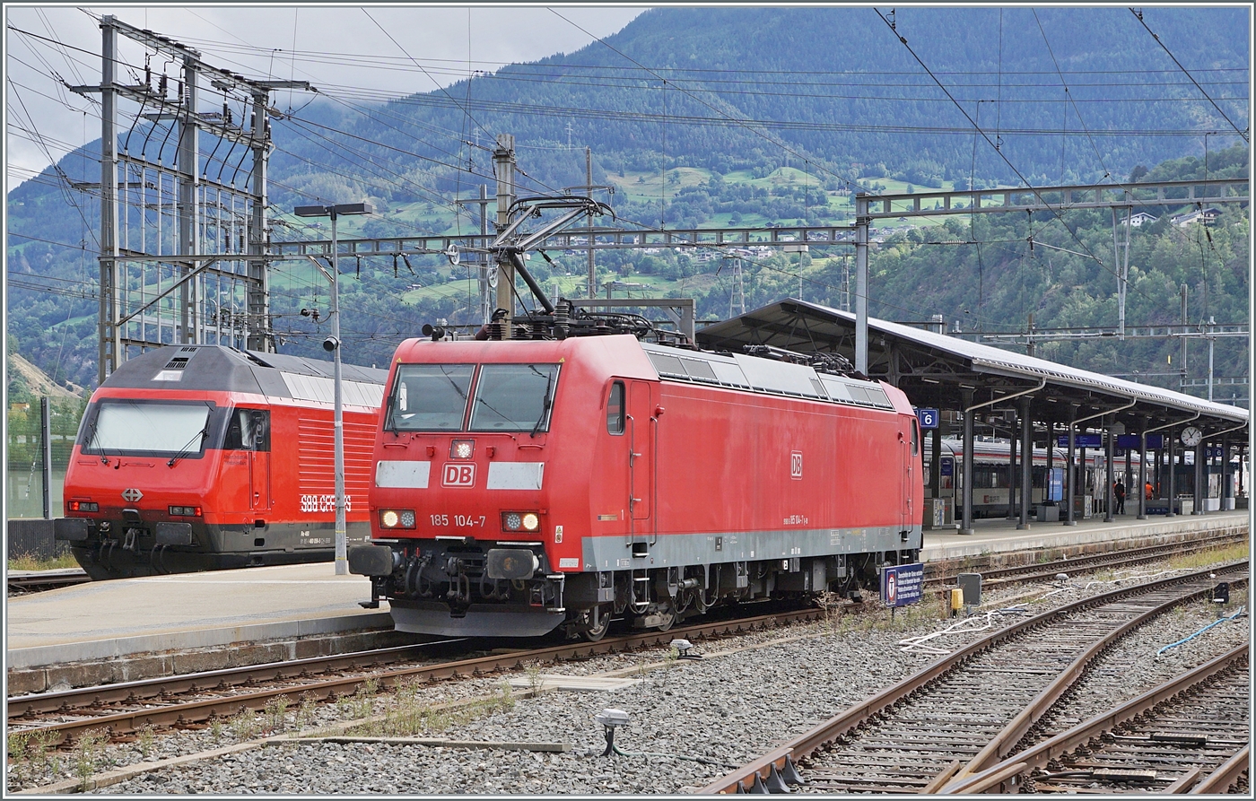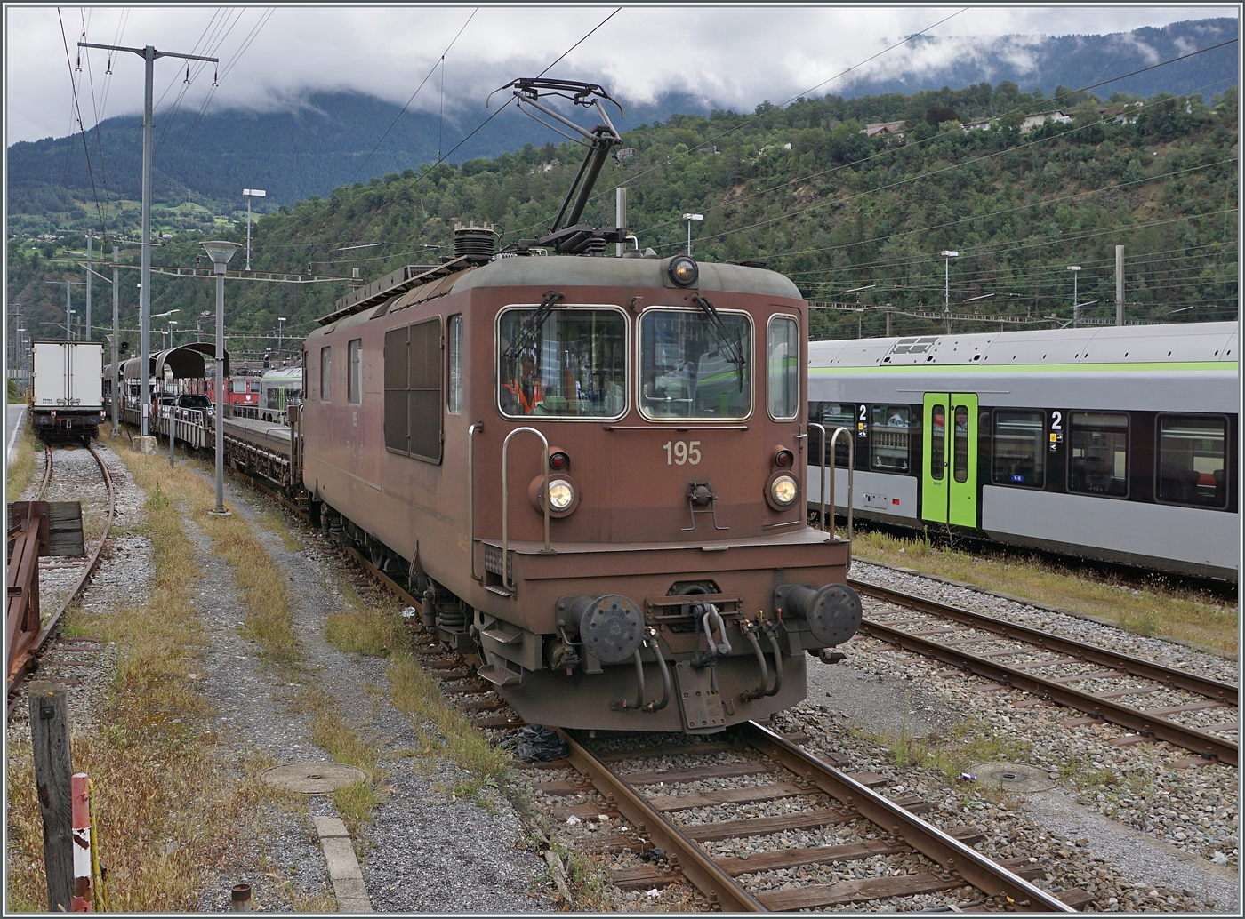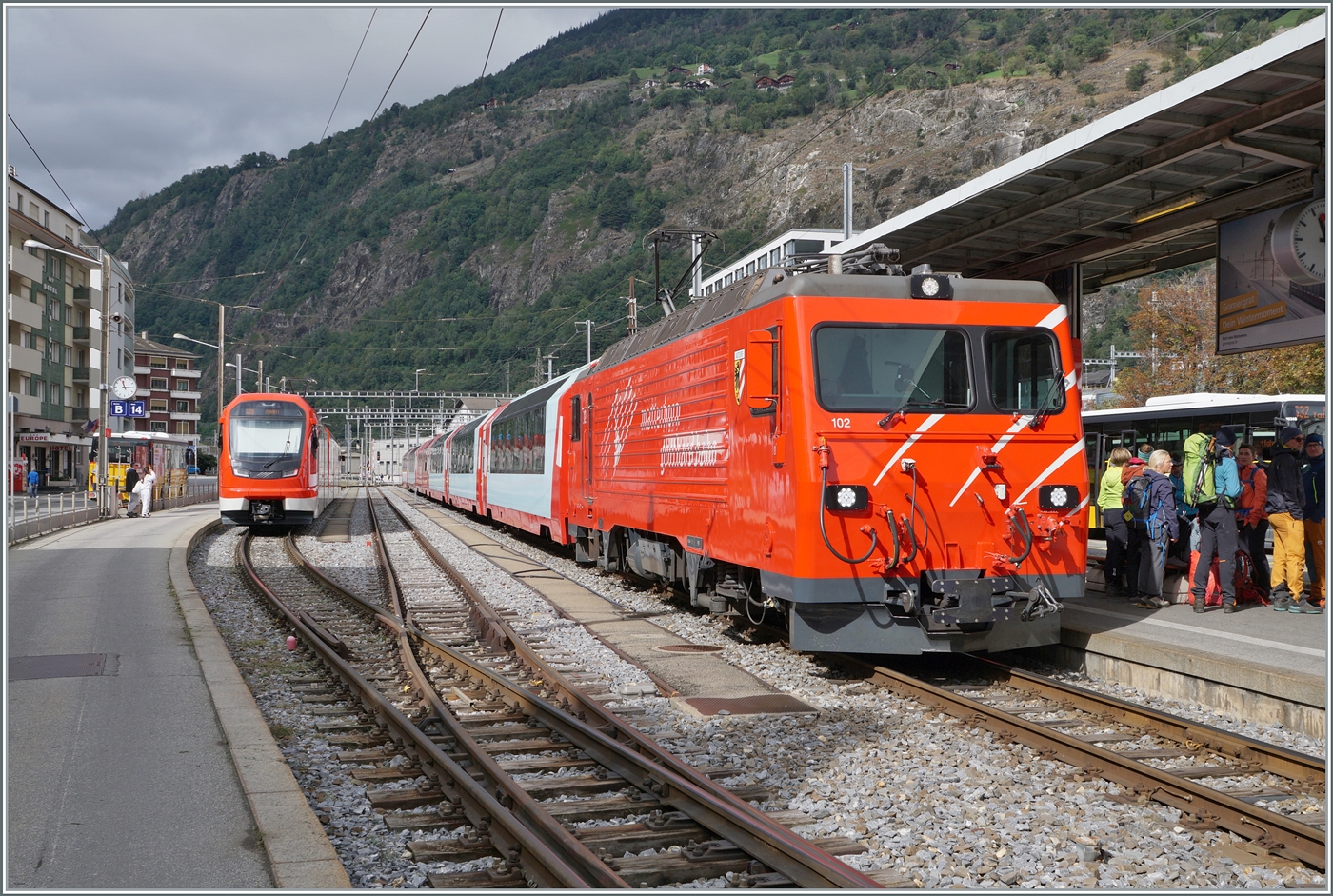 Steuerwagen voraus (ABt 4153, Typ SIG1 Baujahr 1972) erreicht der Regionalzug von Andermatt nach Visp der Matterhorn-Gotthard-Bahn (MGB) am 25.05.2023 den Bahnhof (Vorplatz) Brig. Schubtriebfahrzeug war der Gepäcktriebwagen Deh 4/4 II - 96 "Münster ".