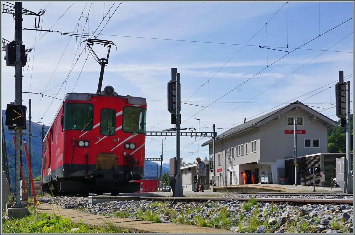 Der Bahnhof Brig vom Bahnhofvorplatz am 07 September 2021in östlicher Blickrichtung. Hier rechts am Bahnhofvorplatz halten die Züge der Matterhorn-Gotthard-Bahn (MGB). Links hinter dem Empfangsgebäude sind auf einem höheren (ca. 1 Stock) die Gleise der SBB CFF FSS (Schweizerische Bundesbahnen).