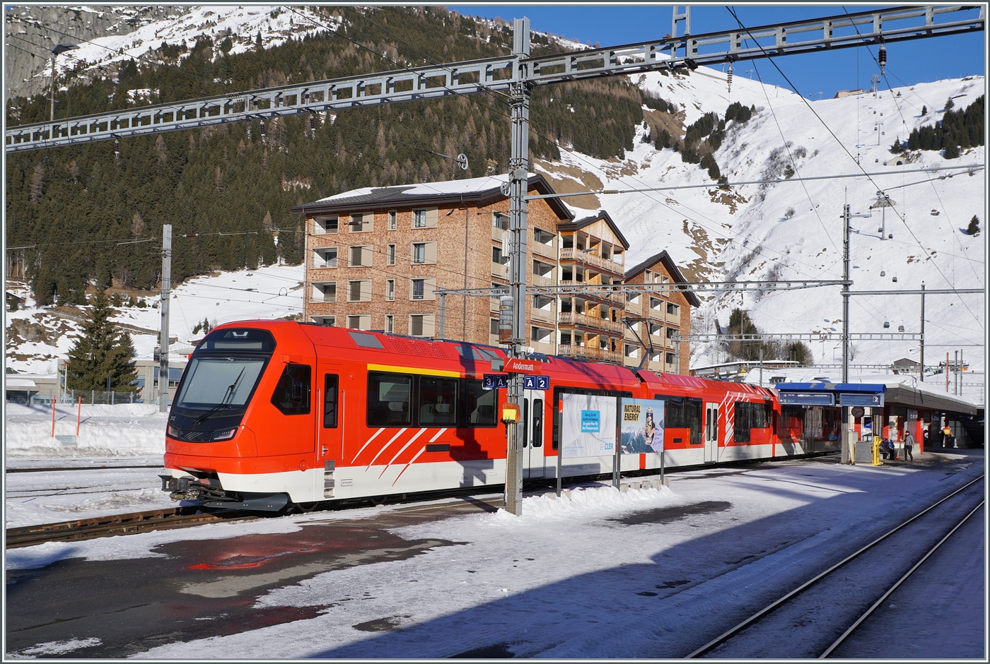 Zwei MGB "Orion" mit dem ABeh 8/12 310 an der Spitze erreichen Andermatt. Der Zug ist als R 45 839 von Disentis (ab 13:14) nach Andermatt (an 14:22) unterwegs.