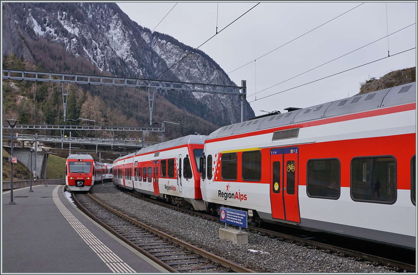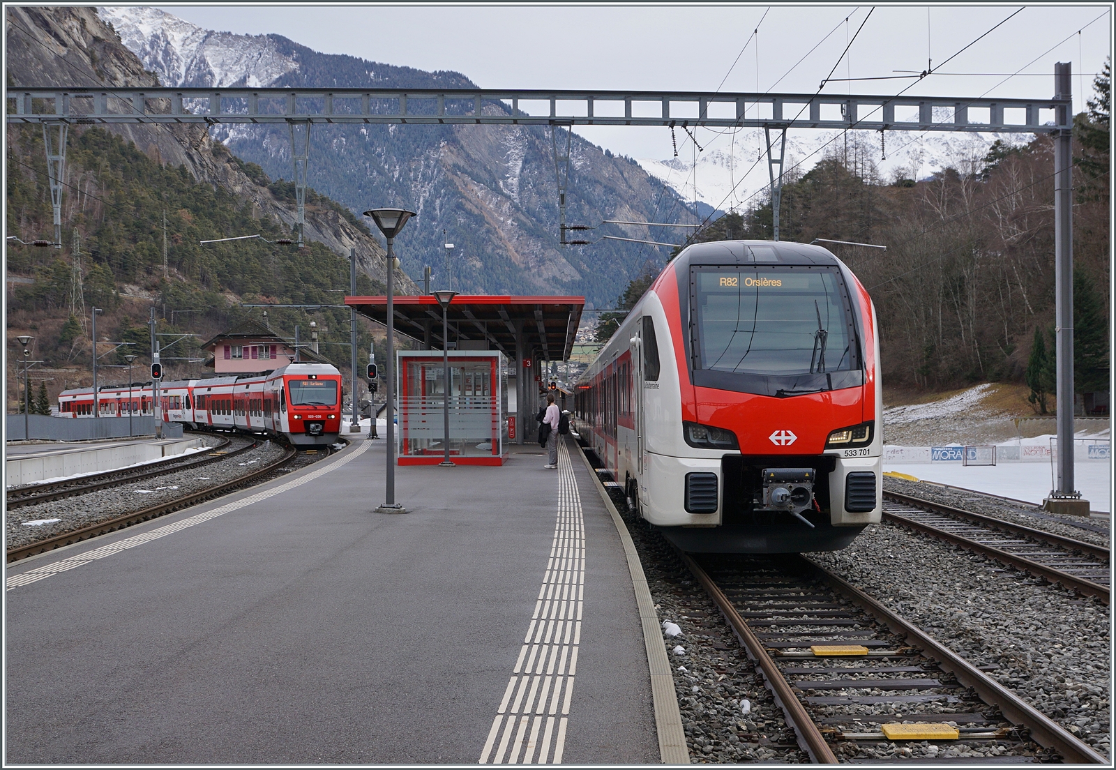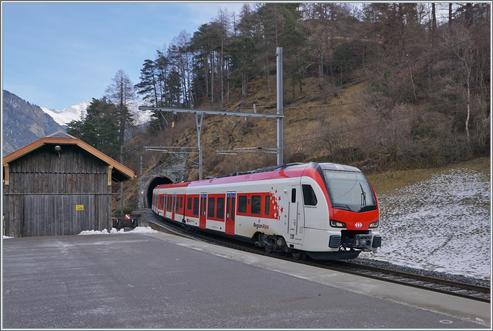 In Finhaut erreicht ein Regionalzug nach Martigny den Bahnhof. Der eingesetzten Triebwagen ist der SNCF Z 801. Zur Zeit der Aufnahme war der Bahnhof mit einer Stromschien ausgestattet, die offen neben den Gleisen lag.