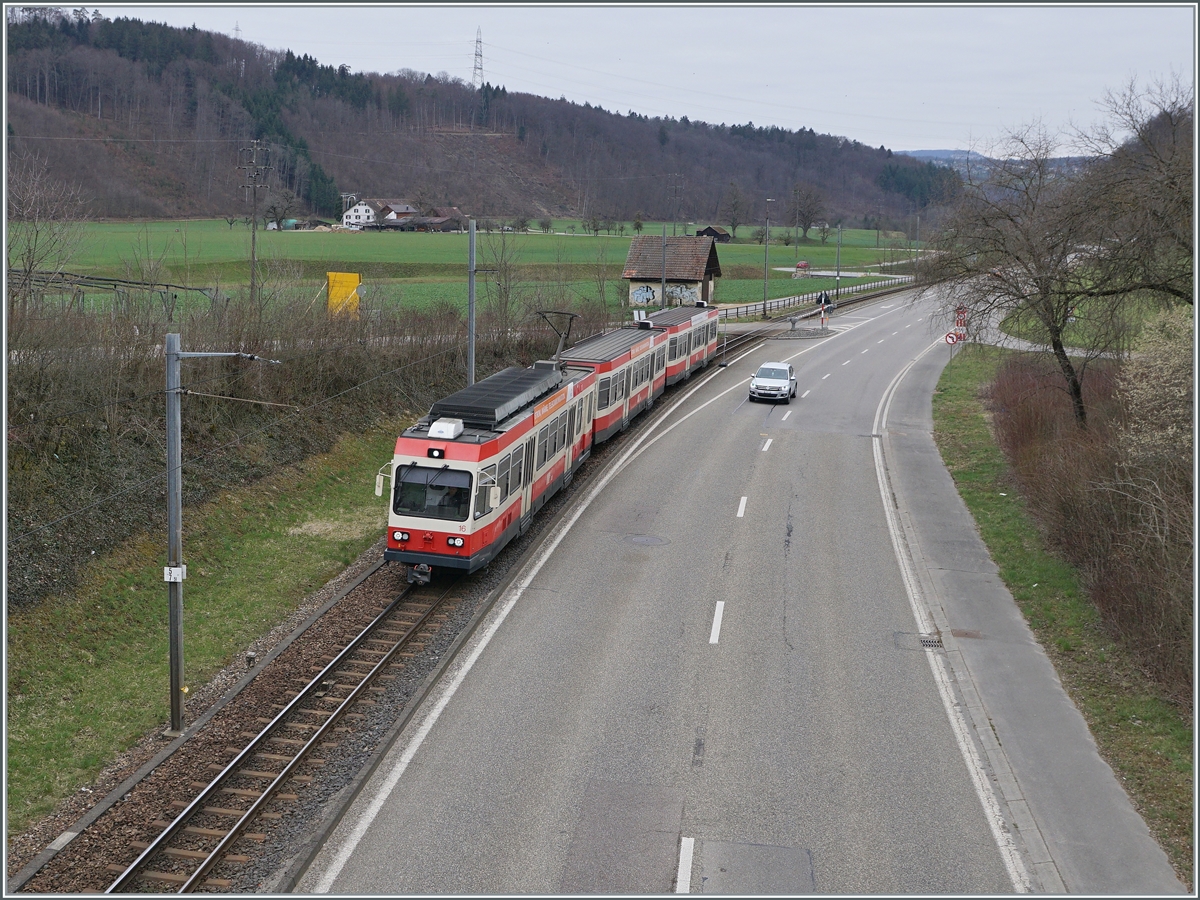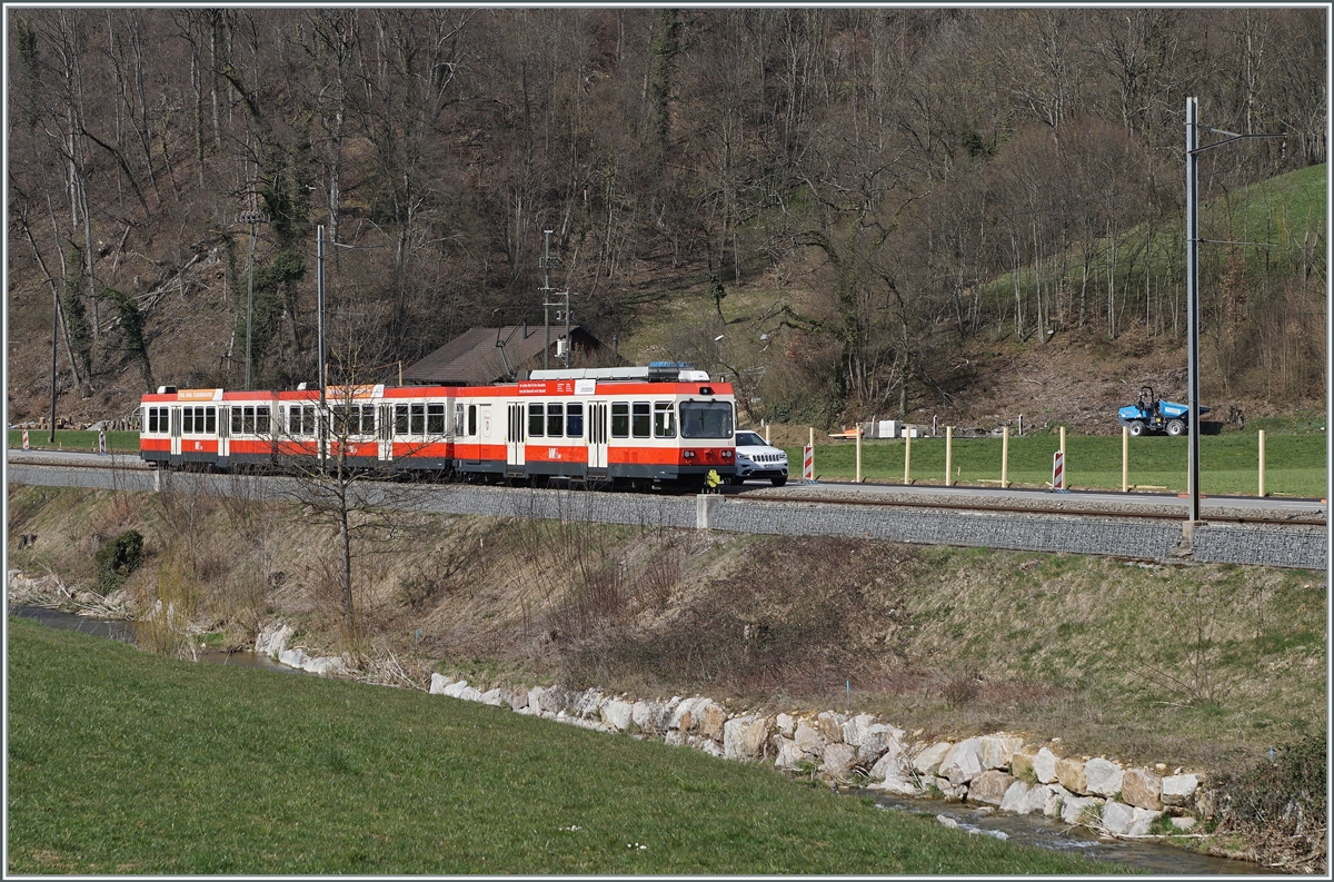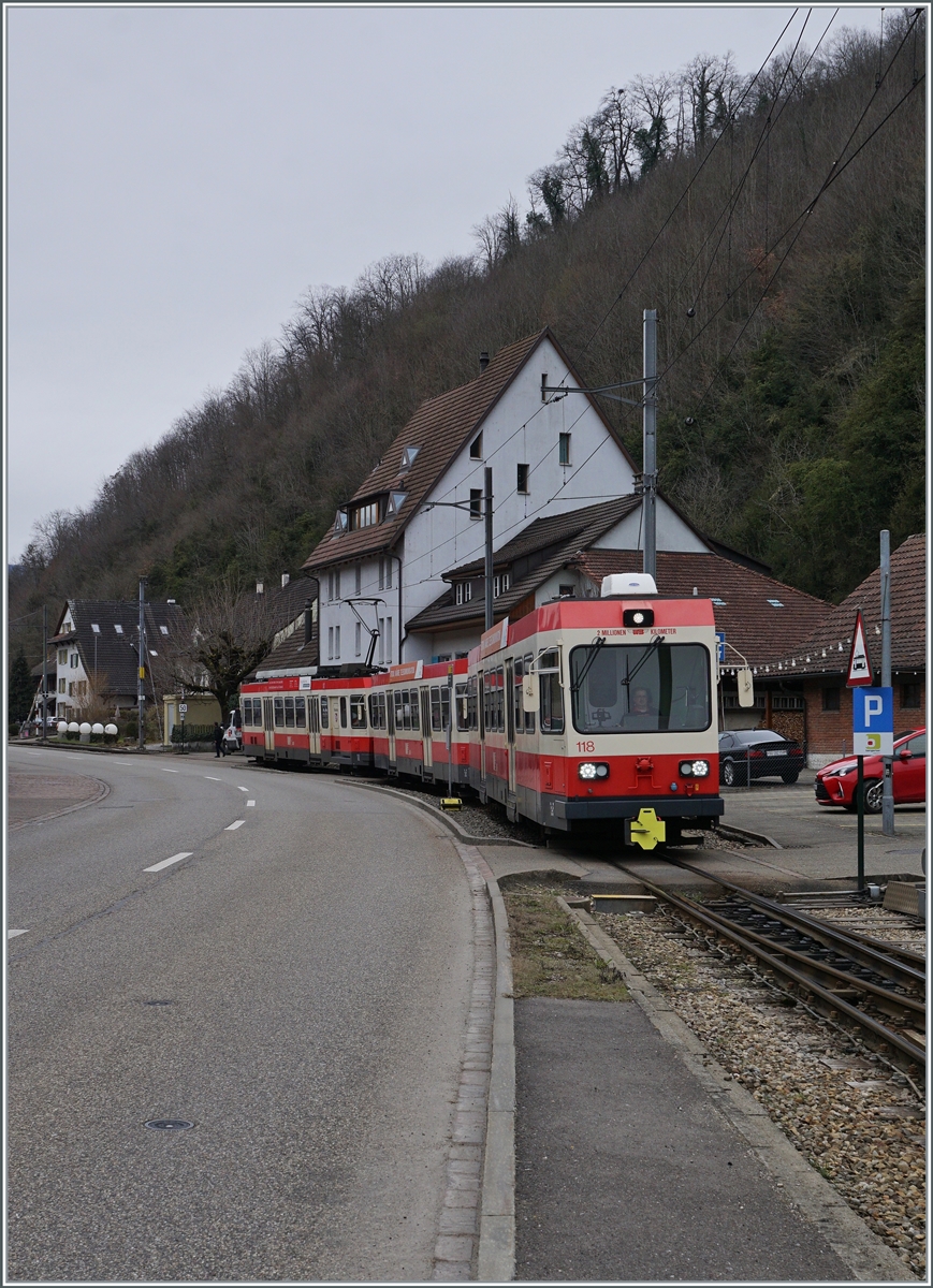 Der neue Waldenburgerbahn WB Be 6/8 101 auf Testfahrt wartet auf den neu verlegten Meterspurgeleisen in Bubendorf Bad auf die Weiterfahrt. Durch die Umspurung von 75 cm auf Meterspur erhält das "Waldenburgeli" ein ganz neuen Charakter.