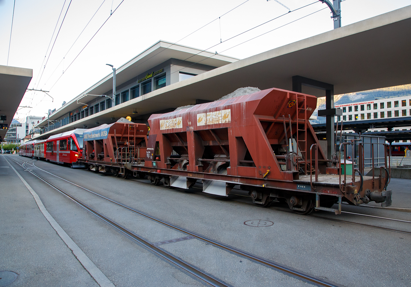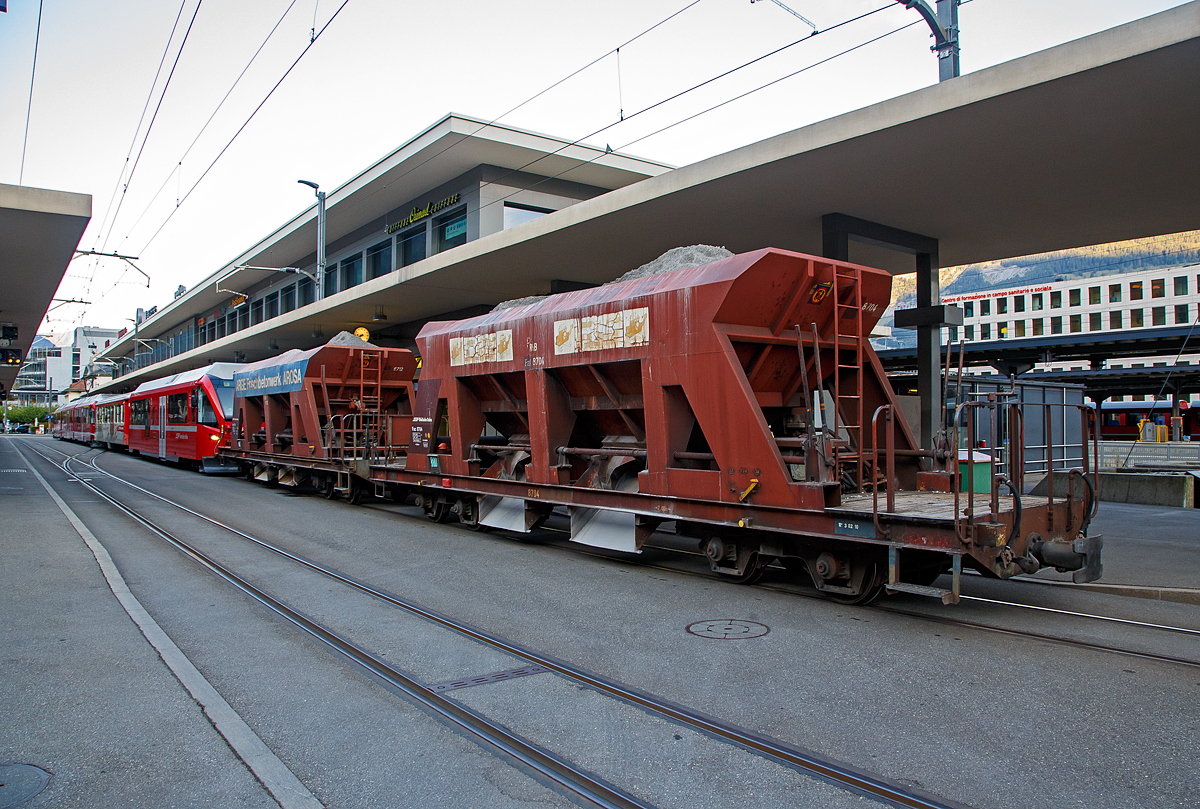 Der vierachsige RhB Bt 528 02 Universalsteuerwagen mit zweite Klasseabteil am 07 September 2021im Zugverband in Chur am Bahnhofsvorplatz, dahinter noch zwei vierachsiger Drehgestell-Schotterwagen (Schwerkraftentladewagen) RhB Fac 8712 und RhB Fac 8704. So ganz „Universal“ sind die Steuerwagen dann doch nicht, denn sie können nur am Stammnetz (StN) eingesetzt werden.