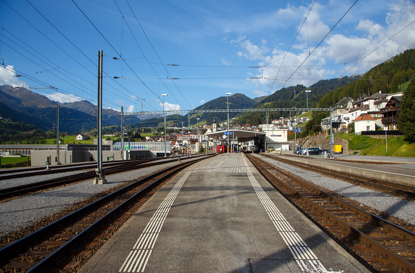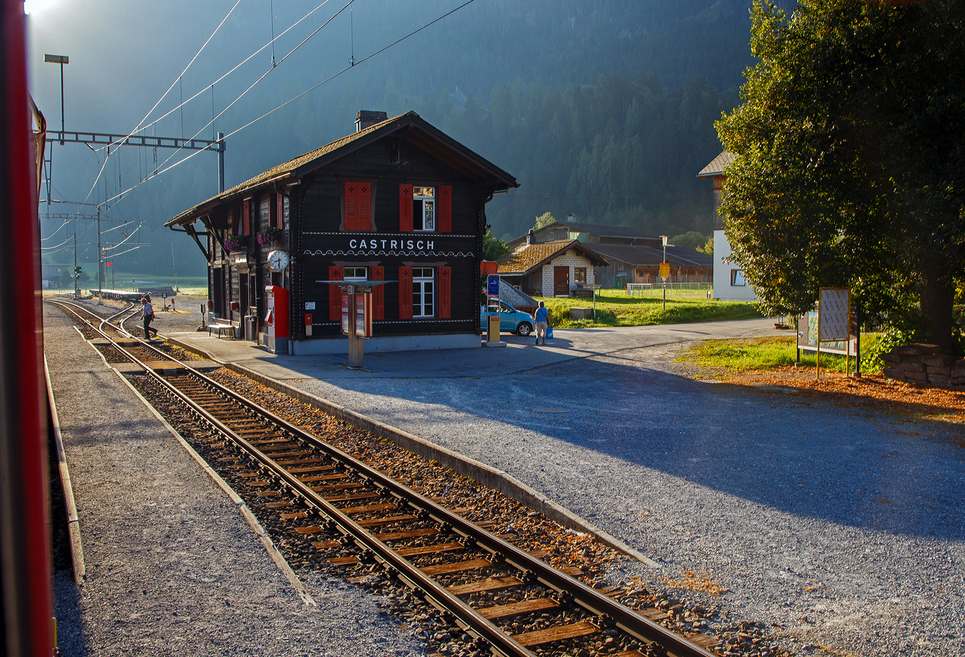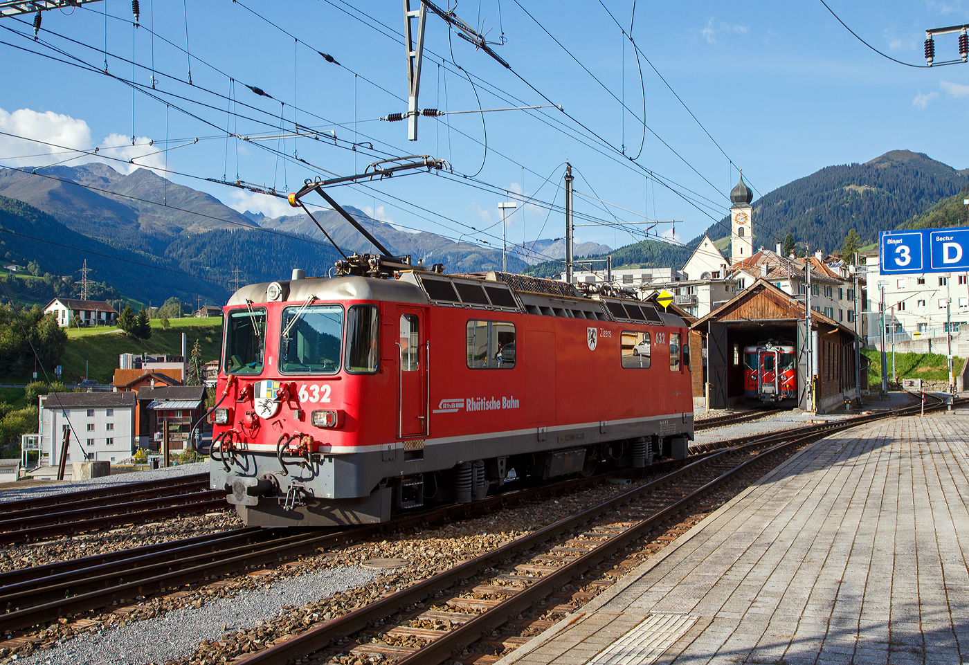 "Bei Disentis", in Werk von 1957 vom Schweizer Maler, Zeichner, Lithograf und Kinderbuchautor Alois Carigiet, hier am 20 Februar 2017 im Bahnhof Alp Grüm, an dem ALLEGRA-Zweispannungstriebzug ABe 8/12 RhB 3515 "Alois Carigiet".