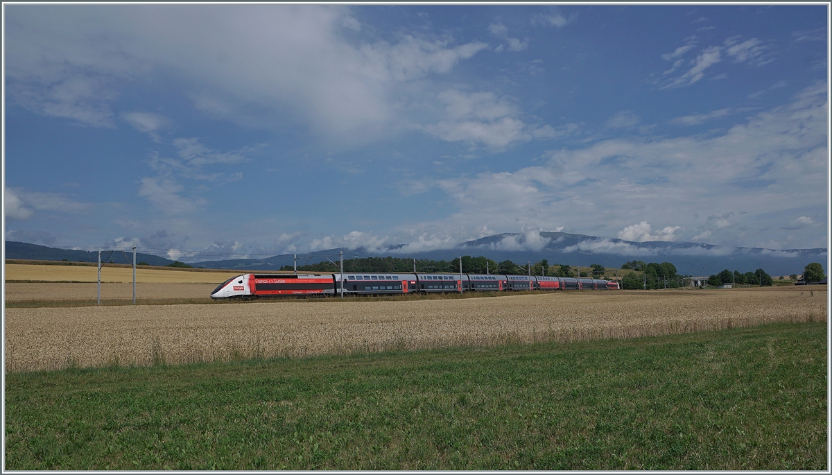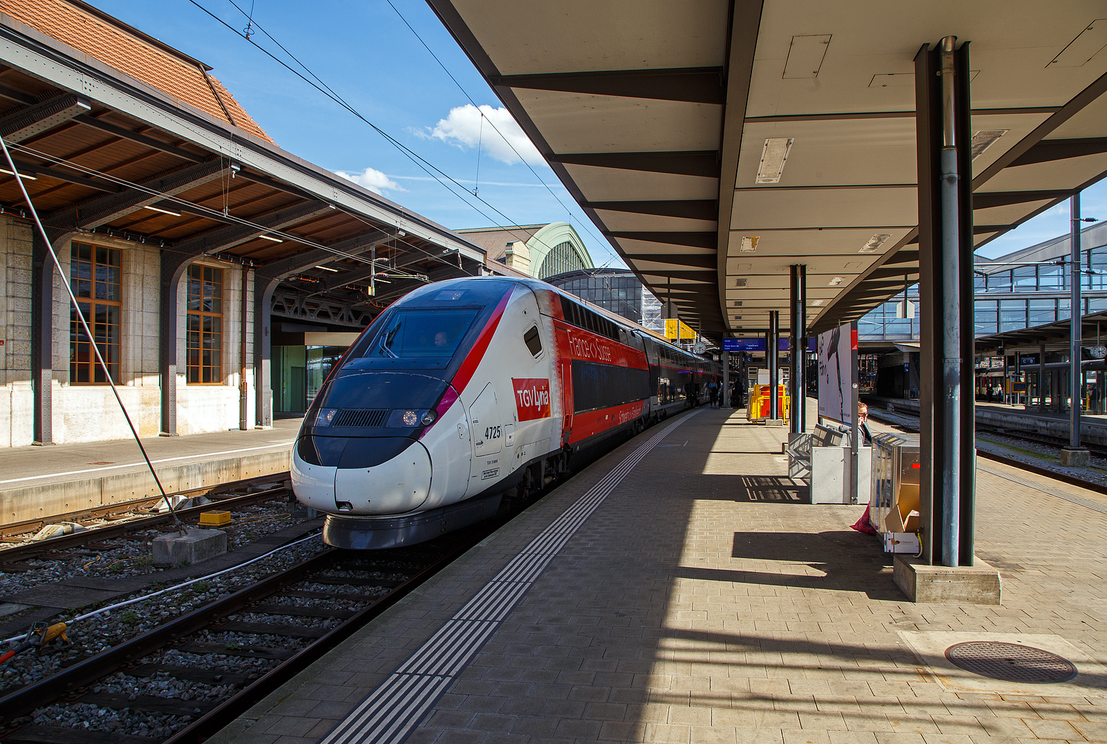 Der TGV Lyria 4418 (TGV 384035 / 384036) steht am 18.05.2018 mit offener Schnauze im Bahnhof Lausanne zur Abfahrt bereit.