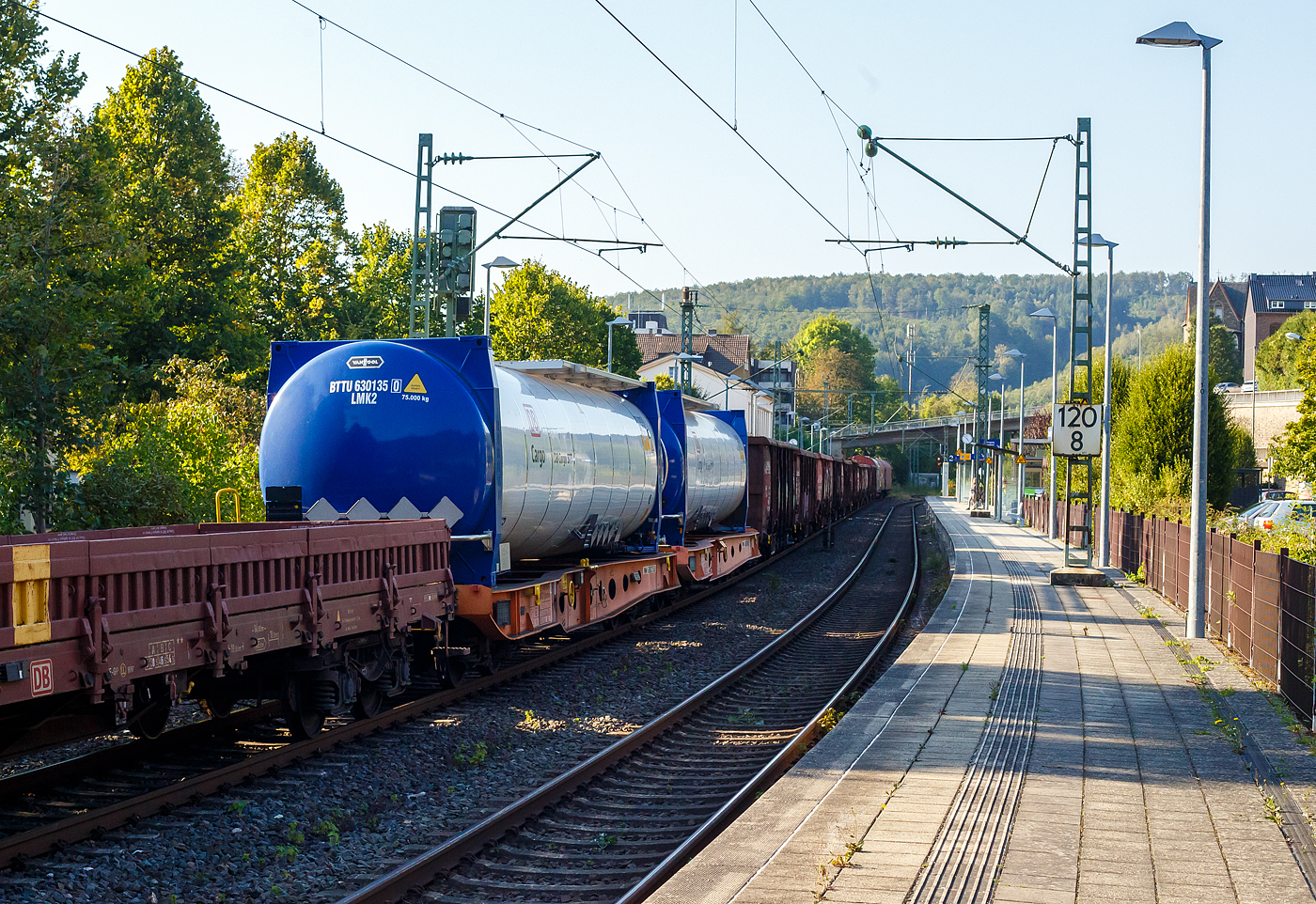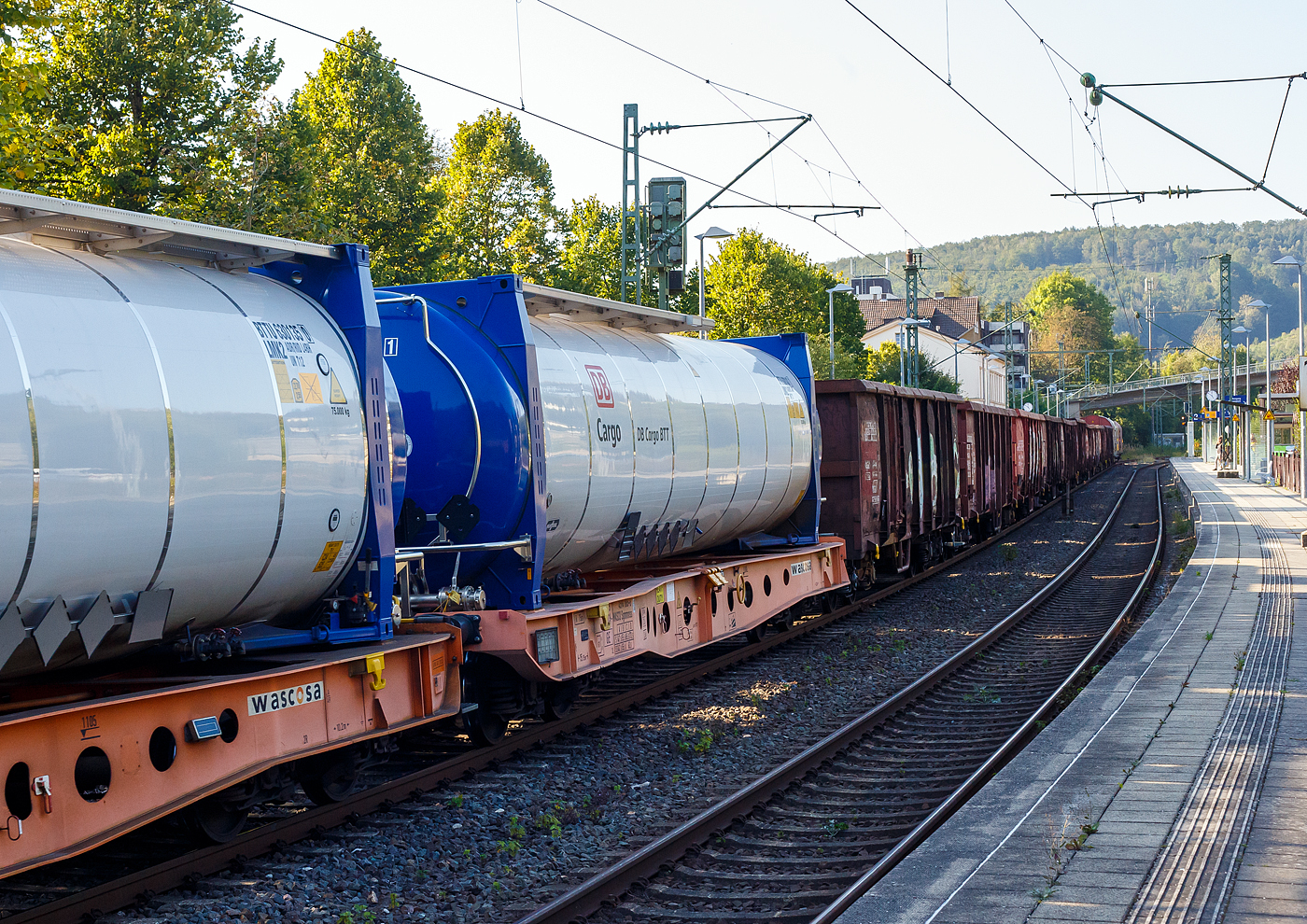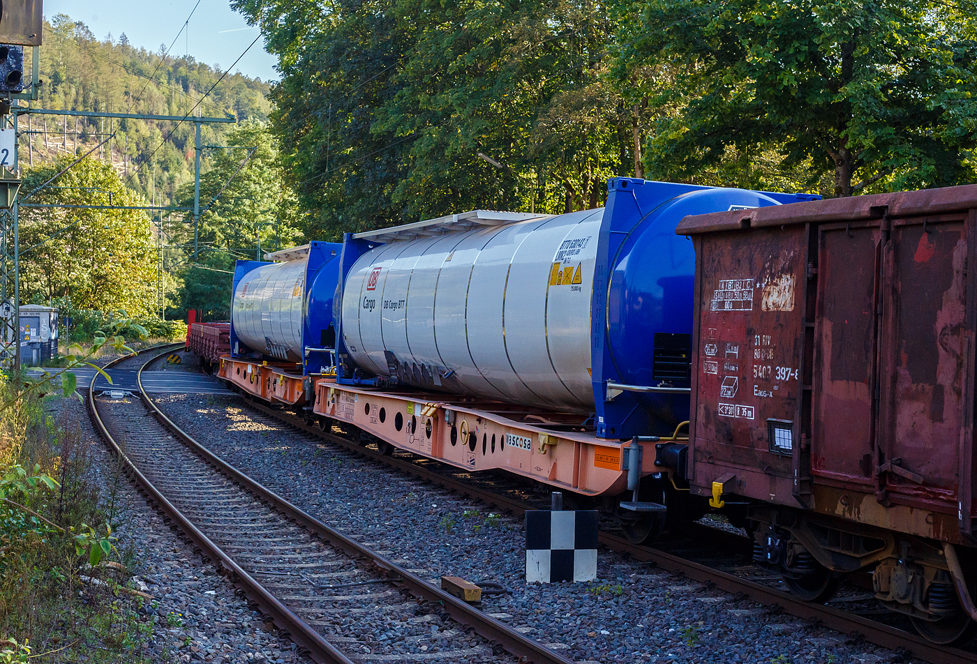 Vierachsiger 45‘ Drehgestell-Containertragwagen, 33 85 4594 105-0 CH-WASCO, der Gattung Sgmmnss, beladen mit 45 Fuß VanHool- Spezial-Tankcontainer der DB Cargo BTT, am 17 September 2024 im Zugverband bei der Durchfahrt im Bahnhof Kirchen (Sieg).