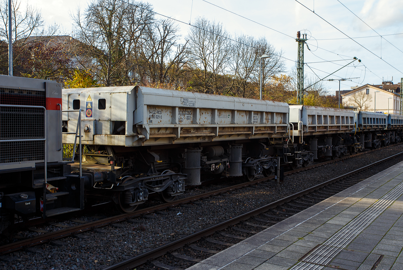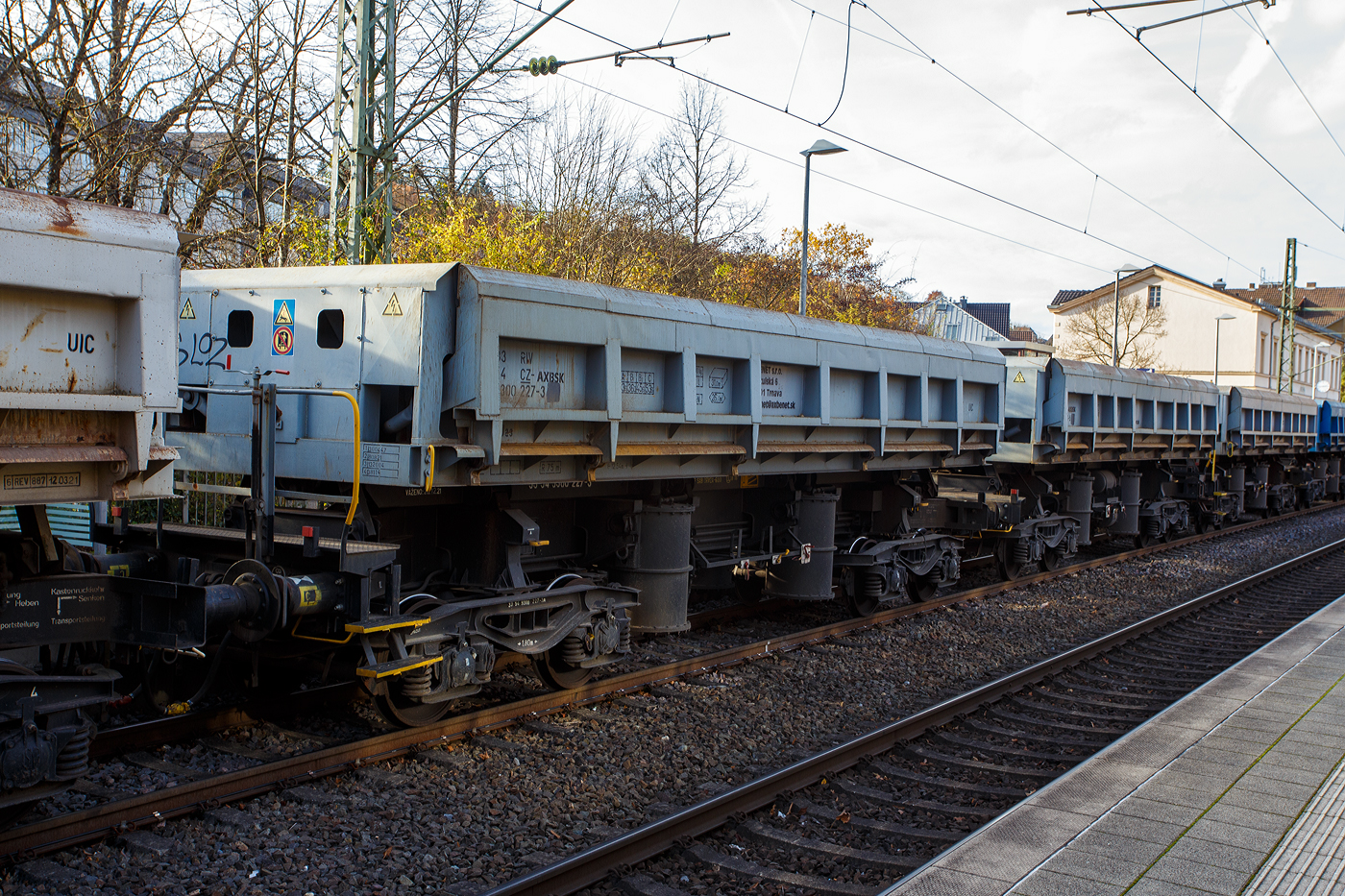 Der 24-achsiger Tragschnabelwagen TSW 348 der Kübler Spedition, UIC 83 54 9964 002-6 CZ ELBA Uaai (eingestellt über ELBA Logistik GmbH) beladen mit einem 300 t schweren (ohne Ölfüllung) 300 MVA Transformator von General Electric ist am 13.10.2018 beim Bahnhof Koblenz-Ehrenbreitstein, mit dem Begleitwagen zum Tragschnabelwagen D-ELBA 56 80 89-40 305-5 WGSmk 855, abgestellt. Mit Ölfüllung würde der Trafo sogar in der Transportstellung 353 t wiegen und könnte dann nicht mehr mit diesem Wagen gefahren werden.