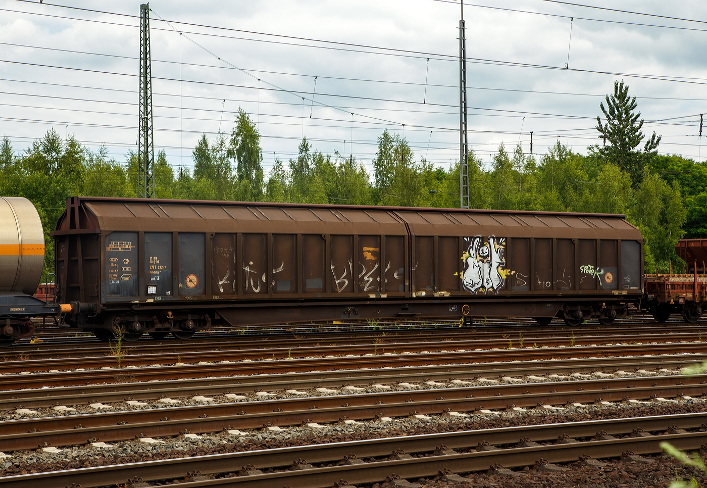 Zwei zweiachsige großräumige ex ÖBB Schiebewandwagen der Gattung Hbis, links 21 81 2254 150-9 A-StH (STH 2) und rechts 21 81 2254 316-6 A-StH (STH 3), der Stern & Hafferl Verkehrsgesellschaft m.b.H. (StH), sind am 04 April 2025 beim Bahnhof Vorchdorf-Eggenberg abgestellt.