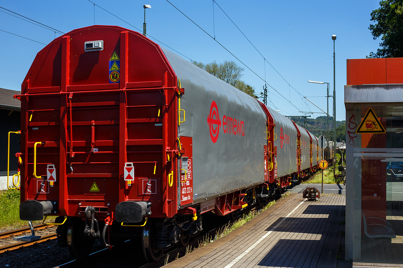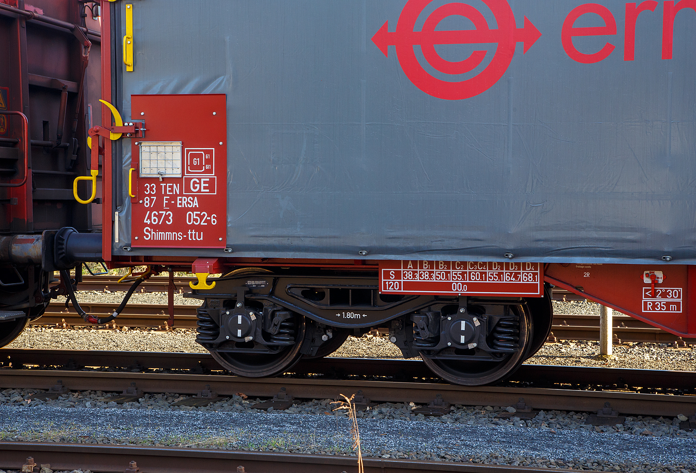 Drehgestellflachwagen mit vier Radsätzen ( Schiebeplanenwagen) , verschiebbarem Planenverdeck und Lademulden für Coiltransporte, der Gattung Shimms 539 der SNCF (31 87 4775 621-7 F-SNCF), abgestellt am 04.08.2013 in Herdorf auf der Gleisanlage der Kreisbahn Siegen-Wittgenstein (KSW).