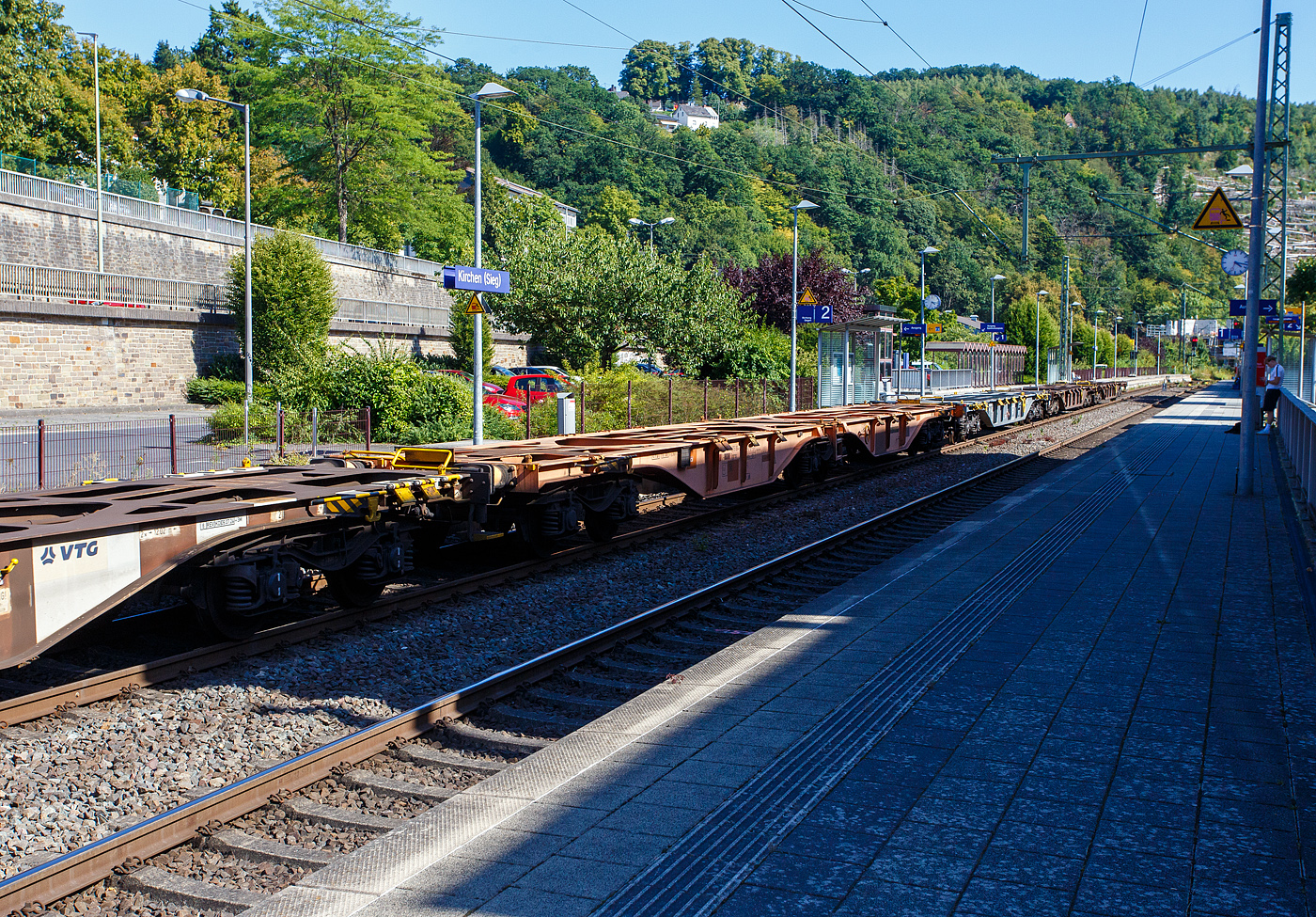 Leerer vierachsiger 60' Drehgestell-Containertragwagen für Großcontainer und Jumbo-Wechselbehälter, 33 87 4552 754-3 F-RCW, der Gattung Sgnss 60' (HP), der Rail Cargo Group (zu ÖBB), am 18 August 2025 im Zugverband bei einer Zugdurchfahrt im Bahnhof Kirchen/Sieg.
