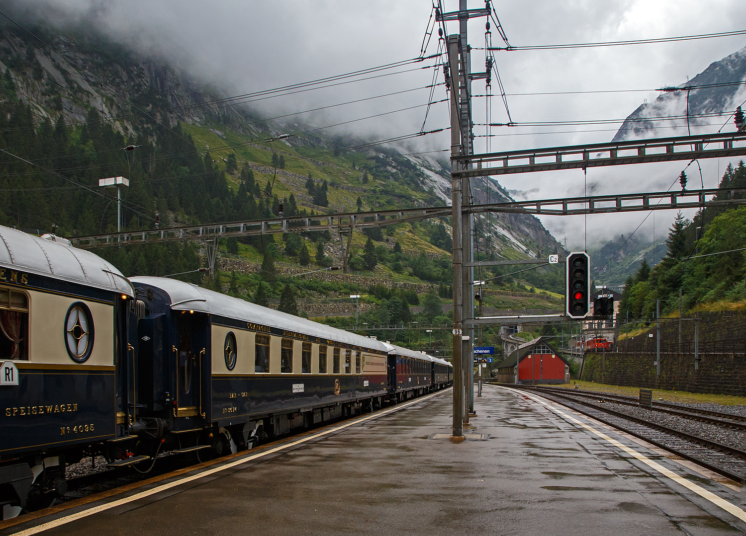 Der VSOE Schlafwagen Nr. 3483 – VSOE VSOE Sleeping-Car / Voiture-Lits / Carrozza-Letti N° 3483 (F- VSOE 61 87 06-70 483-9) im Zugverbund vom Venice Simplon-Orient-Express am 02.08.2019 beim Halt in Göschenen (CH), leider bei Regen.