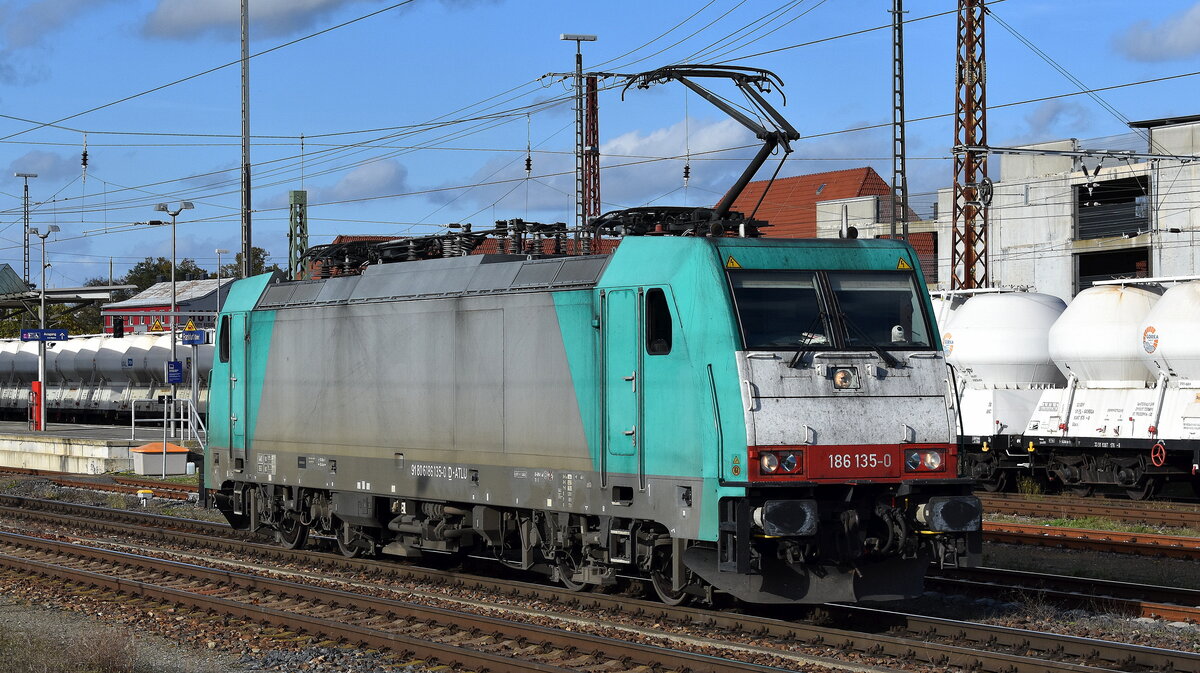 Transchem Sp. z o.o., Włocławek [PL] mit der geleasten polnischen ATLU Lok "E 186 250-7" [NVR-Nummer: 91 51 5270 003-4 PL-TM] und einem Kesselwagenzug (für Benzol) am 29.10.25 Höhe Bahnhof Frankfurt/Oder.