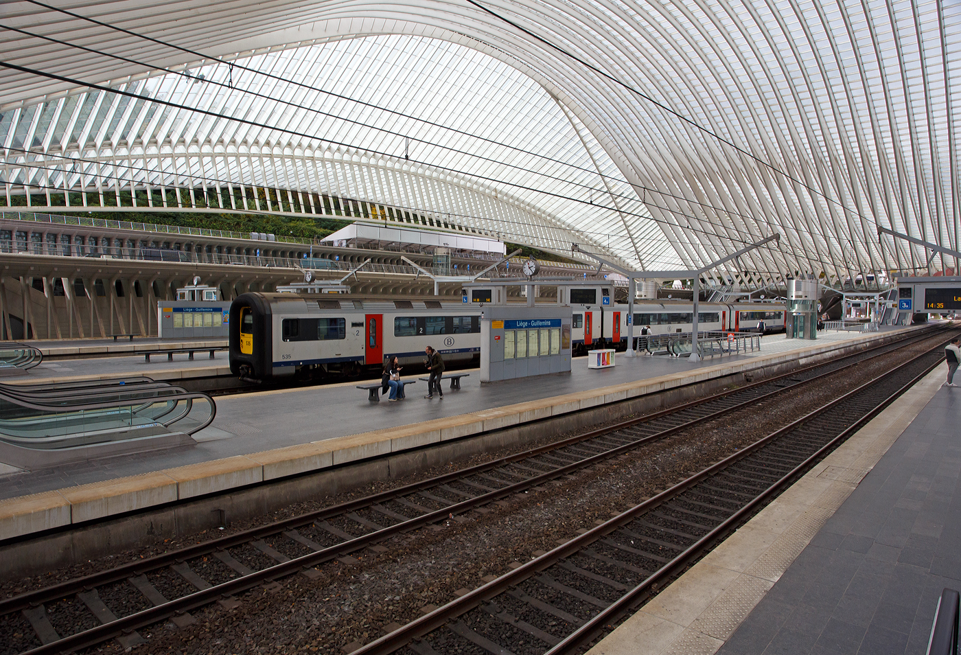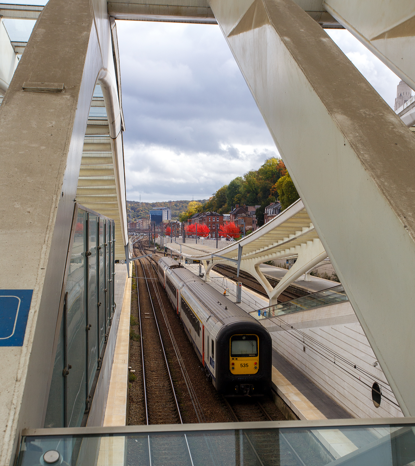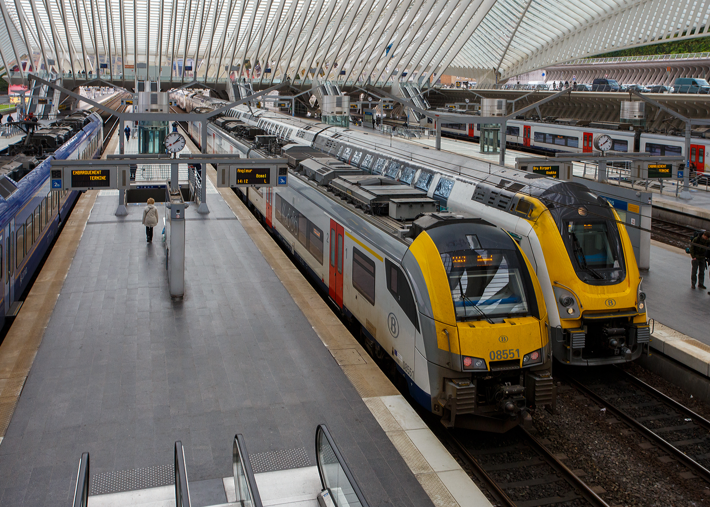 Ein sehr langer M7 TWINDEXX-Triebwagen-Zug hat am 21 Oktober 2025, als IC über Brüssel Flughafen, Gent und Brügge, an die Küste nach Knokke, den Bahnhof Liège-Guillemins verlassen.