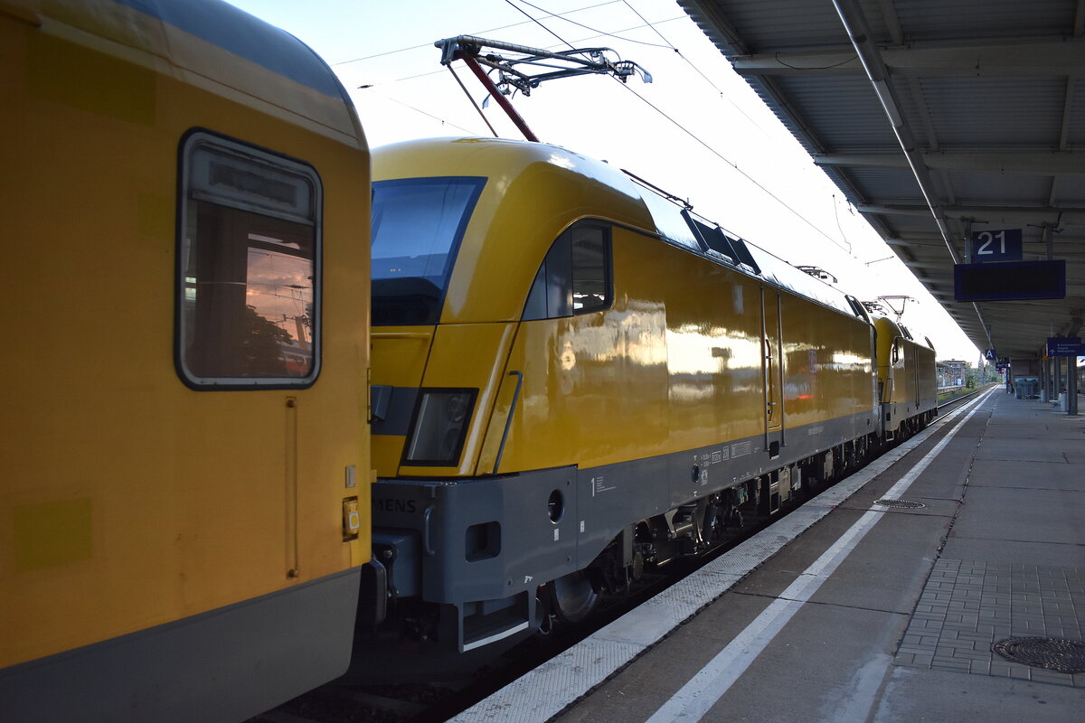 DB InfraGO AG, Frankfurt (M) schiebt mit der "182 536" (NVR: "91 80 6182 536-3 D-DBMP") einen Messzug mit Steuerwagen an am 17.03.25 Höhe Bahnhof Schönefeld b. Berlin nachdem zwei Mitarbeiter zugestiegen sind.
