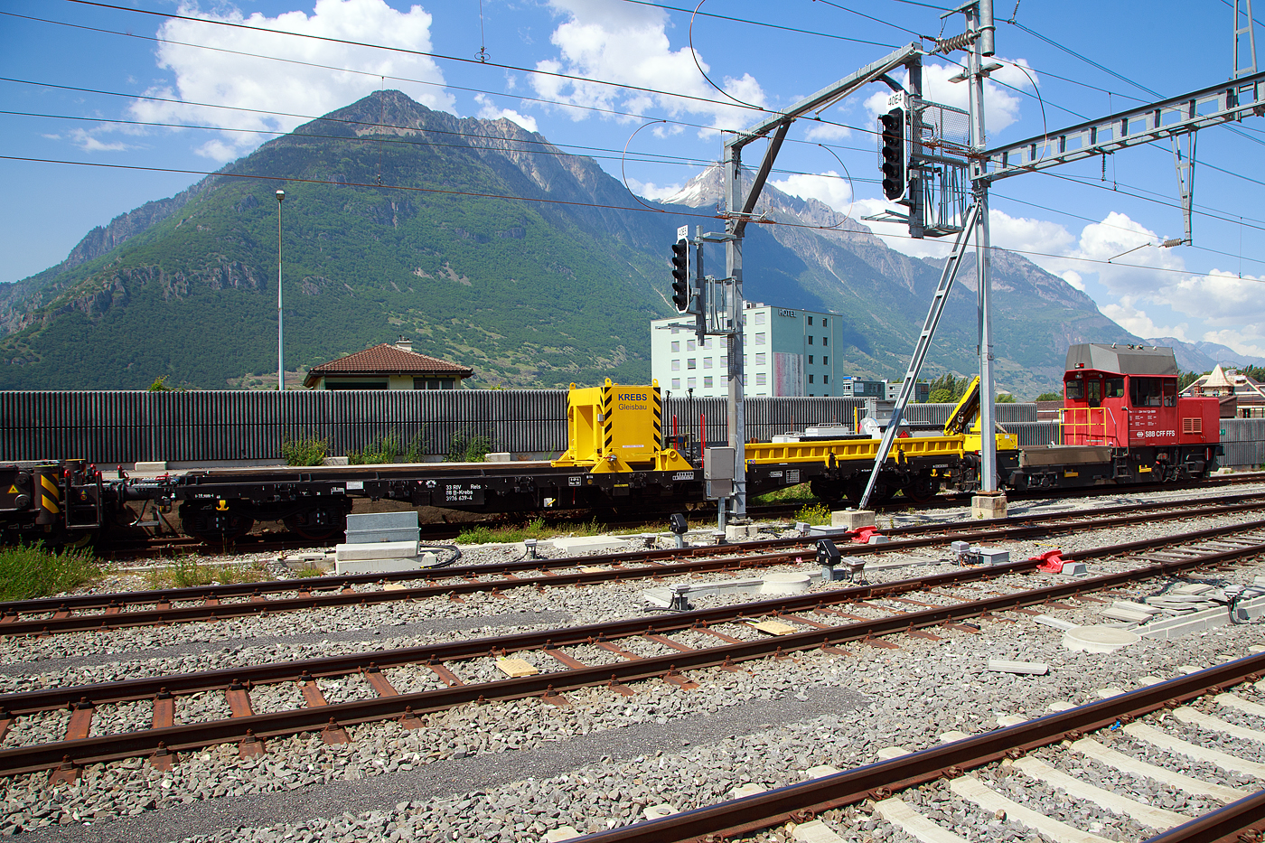 Der 130 t Eisenbahnkran D-KREBS 99 80 9419 008-4, ex 97 82 54 501 17-1, ein GOTTWALD GS 130.06 TT Gleisbauschienenkran der Krebs GmbH & Co. KG, Bingen am Rhein (D) / Bern (CH) ist am 26.05. 2023 beim Bahnhof Martigny, in Transportstellung mit dem Gegenlastwagen 33 88 3936 639-4 B-Krebs der Gattung Rels und dem Schutzwagen auslegerseitig 99 80 9383 003-7 D-Krebs der Gattung Rgs, abgestellt.
