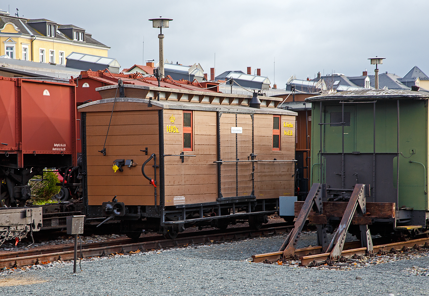 Der vierachsige Gepäckcontainer-Tragwagen 94/11 der Inselbahn Langeoog vom Eigenbetrieb der Schiffahrt der Inselgemeinde am 13 Februar 2024 im Insel Bahnhof Langeoog (im Ort Langeoog).