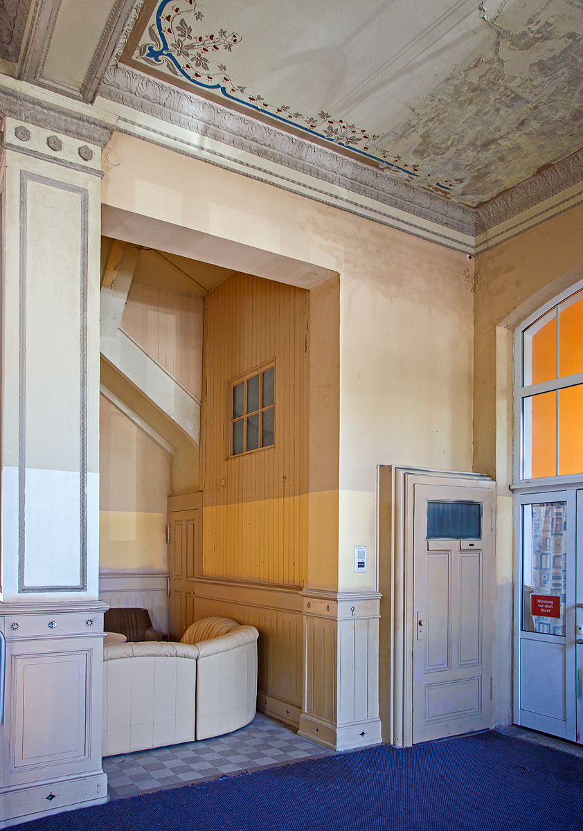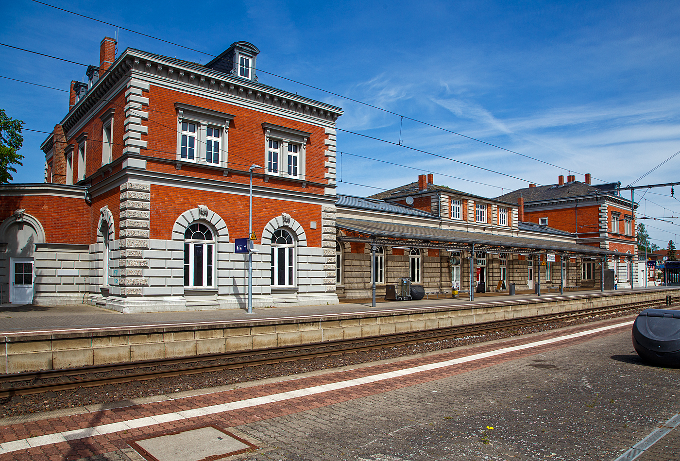 Das sehr schöne Empfangsgebäude vom Bahnhof Bützow am 16.05.2022 von der Gleisseite.