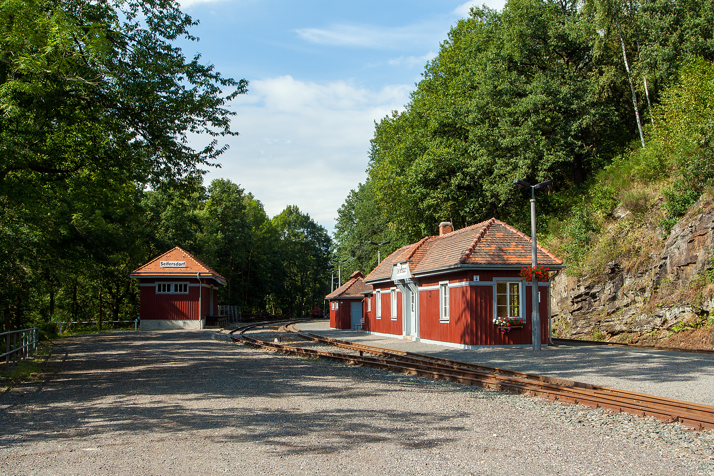 Der Bahnhof Seifersdorf der Weißeritztalbahn am 26.08.2013. Seifersdorf ist ein Ortsteil der sächsischen Großen Kreisstadt Dippoldiswalde im Landkreis Sächsische Schweiz-Osterzgebirge.