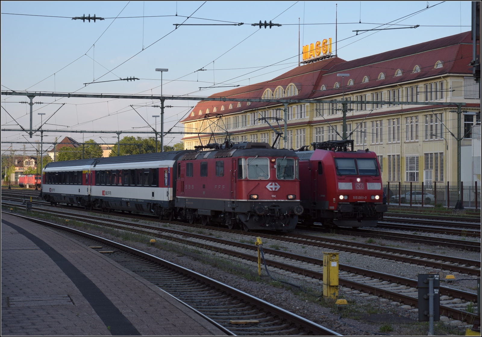 Die 218 417 als Zugpferd der Hochrheinbahn kam als willkommene Zugabe zum Radexpress Bodensee daher und bot Gelegenheit für ein Bild mit 218 256 der NeSA. Für den Fotografen eine besonders nette Dreingabe. Singen, Juli 2024.