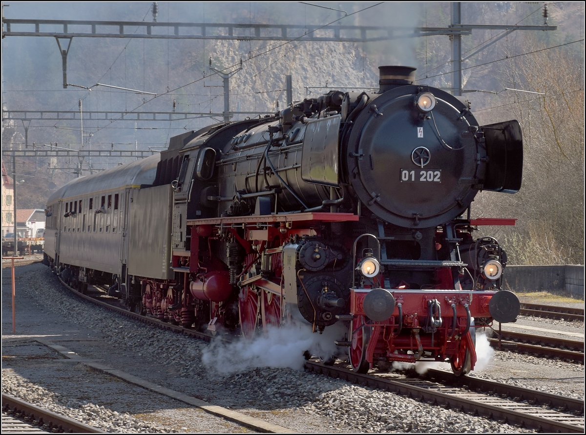 01 202 mit Gotthardsonderzug bei Dottikon Umspannwerk, März 2015.