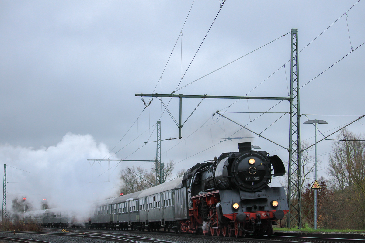 Da hofft man auf massig Dampf und dann dreht der Lokführer die Leistung ab... Na toll. Die 03 1010 (90 80 0013 010-8 D-HLP) des DB Museum Nürnberg, welche zur Zeit an die Traditionsgemeinschaft Bw Halle P e.V. verliehen ist, durchfährt mit ihrem Sonderzug der Eisenbahnfreunde Treysa zum Butzbacher Weihnachtsmarkt am 02.12.2018 den Bahnhof Cölbe in Richtung Gießen.